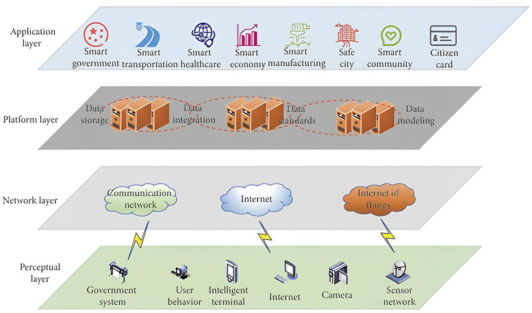Several research studies have focused on the design of a generic architecture for smart cities at a global level. Figure 1 gives a view of smart city architecture. This architecture is composed of four layers: perceptual layer, network layer, platform layer, and application layer (Zhao and Zhang, 2020). This design is useful in capturing the key components of smart city operations since it helps in planning and describing different smart city technologies in the simplest and clearest manner possible.