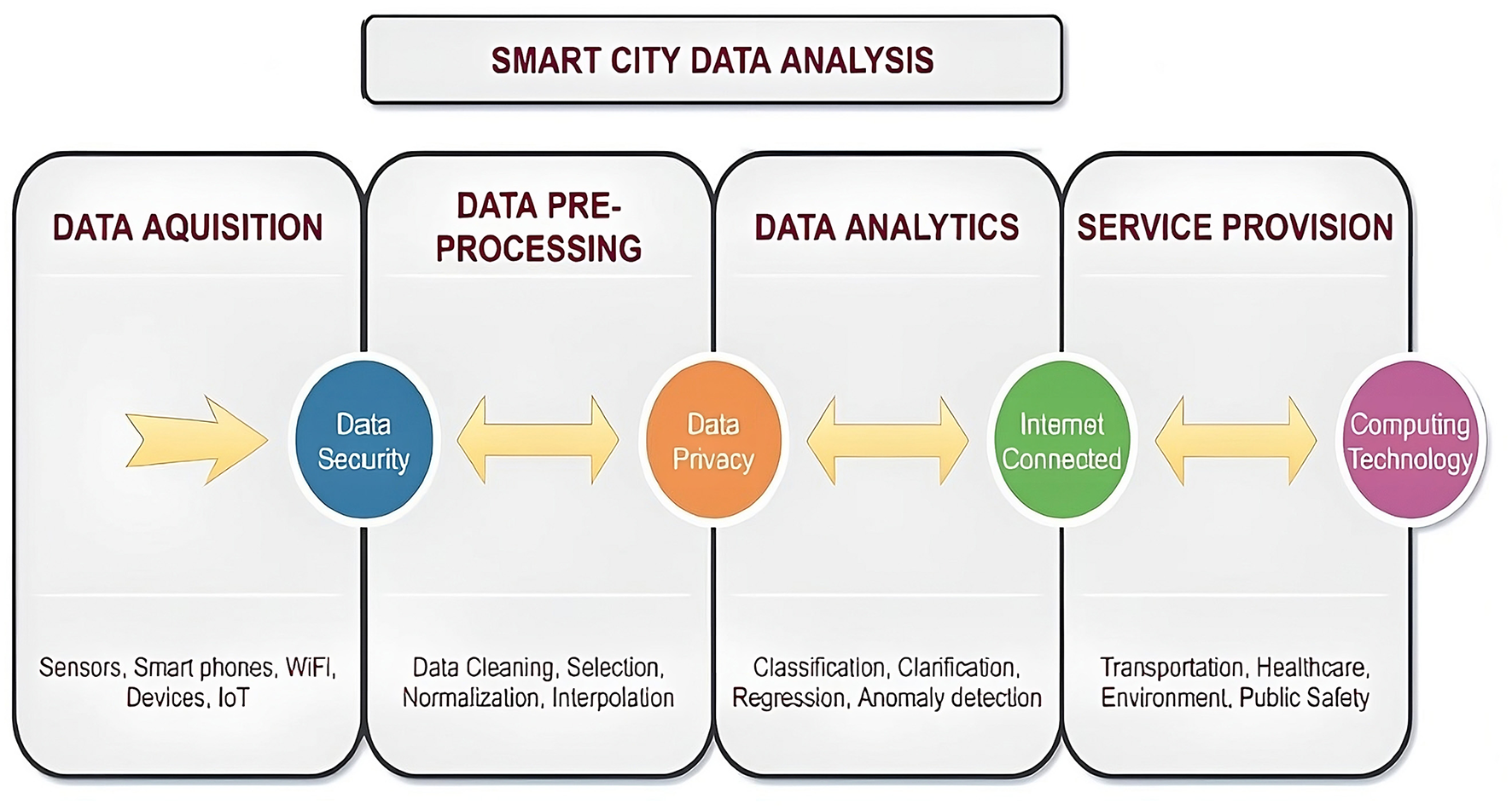 This layer collects data from various sources by implementing physical equipment like cameras, microphones, GPS trackers, and other types of sensors. Collecting data from multiple sources is a difficult task because the data is mostly unstructured and varied. This has constituted a big challenge in deploying and exploiting wireless sensor networks (WSNs) in smart cities. Other aspects of effective data collection include proper management of energy consumption, resource exploitation, and transmission costs. By using various approaches to collect heterogeneous data from diverse applications, the delay-tolerant network (DTN), like vehicle DTN, can enhance data collection in a smart city. Also, several types of data collection implement comprehensive coverage. Environmental sensors monitor air quality and weather, while smart meters monitor energy consumption in homes and businesses. Real-time use of GPS and passenger counters in transport systems has led to increased efficiency and reliability through rerouting and rescheduling.
