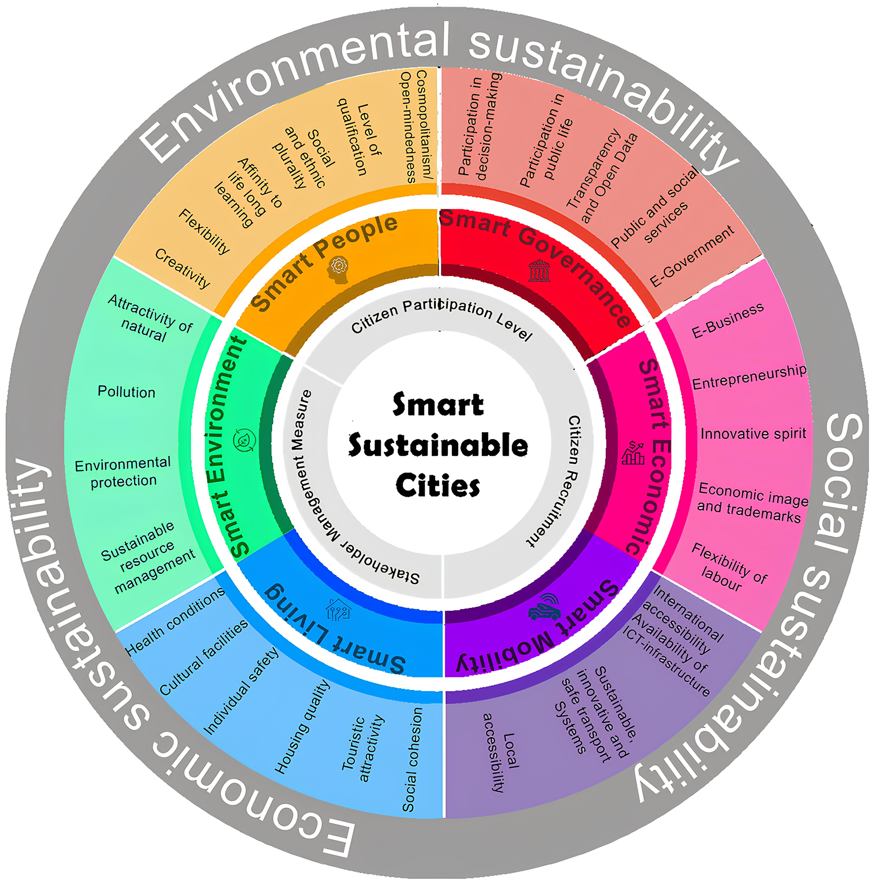 Additionally, economic prosperity is a critical element of the framework of sustainable smart cities, as it offers long-term economic development, innovation, and entrepreneurship opportunities in urban areas. This dimension emphasizes the promotion of local enterprises and start-ups, the investment in research, development, and innovation, the enhancement of employment training and workforce development programs, the promotion of tourism and cultural heritage, and the promotion of economic diversity and resilience planning. The promotion of economic development is instrumental in establishing robust, dynamic urban economies that create the necessary conditions for residents' growth and prosperity, thereby introducing opportunities to this frequently overlooked region.