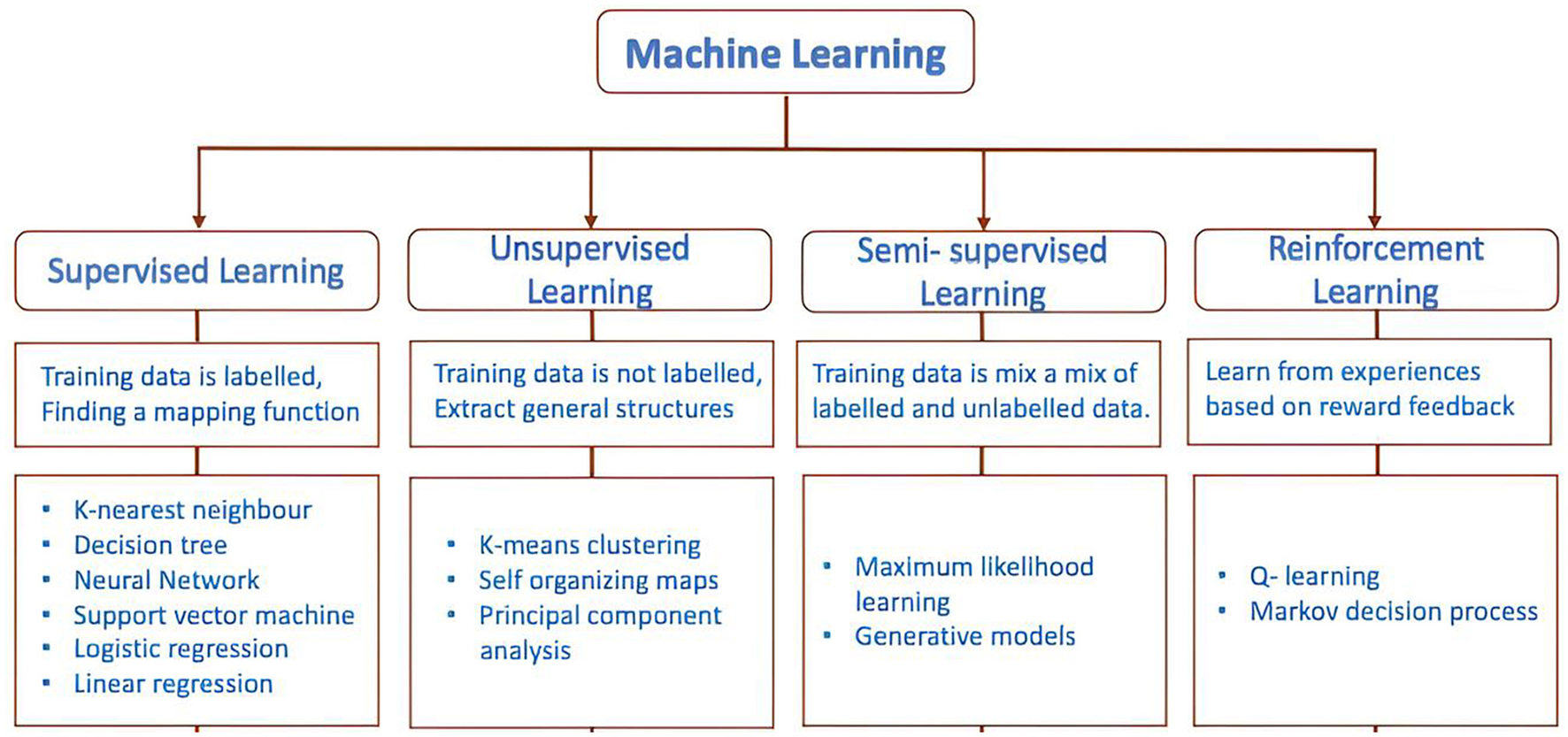 | Common algorithms | Decision trees, support vector machines, neural networks | K-means clustering, hierarchical clustering, principal component analysis | Self-training, co-training, graph-based methods | Q-learning, deep Q-networks, policy gradient methods |