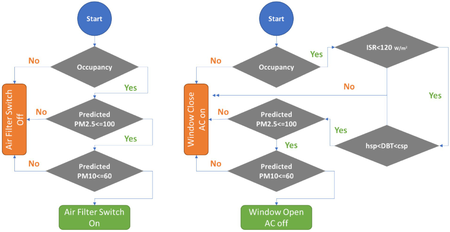 In the smart case, the air filter has been operated based on the predicted indoor PM2.5 and PM10 limits (Figure 4). The pollutant infiltration to the zone per individual window has been computed based on the indoor and outdoor pressure differences. In the real world, the smart system being proposed scraps weather forecasts from open-source websites. The indoor weather monitored by sensing devices in smart system predicts the pressure difference using validated mathematical models of computational fluid dynamics. The volume mass flow rate of air for provided fenestrations in the zone would also be accounted by the smart system to operate the windows. Other than pollutant concentrations, the occupancy, DBT and ISR have also been considered similar to basecase. Figure 4B shows the operation logic of window and ACs for smart case. The base case and smart case operational logics have been scripted in EnergyPlus (EP) Energy Management System (EMS) class through EnergyPlus Runtime Language (Erl). The EP is an open-source tool (Invidiata and Ghisi, 2016) that simulates the air flow network, thermal performance and energy performance for the virtually modeled building. The EnergyPlus Weather File (EPW) file of Delhi has been used as representative weather dataset for simulation. The PM2.5 and PM10 hourly data for 3 years has been extracted from Central Pollution Control Board of India data repository (CPCB, 2016; Mishra et al., 2021) and averaged out to create typical pollution dataset for Delhi. The weather and pollution data has been used to simulate and predict pollutants infiltration per window.