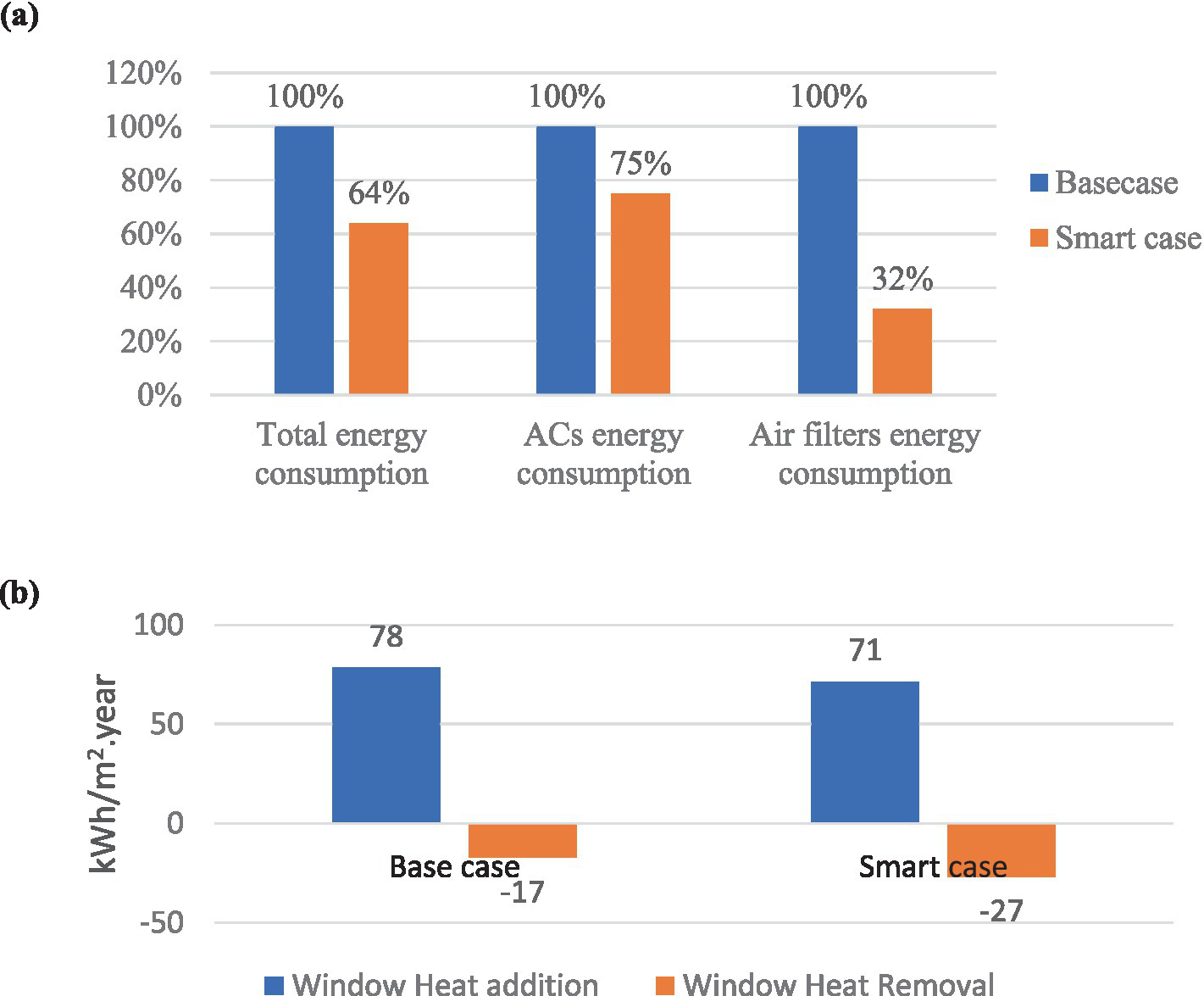 (A) Comparison of energy performance between base case and smart case. (B) Comparison of heat transfer through windows in base case and smart case.