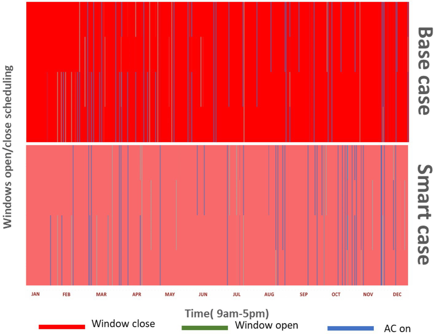 Comparison of window open close schedule in base case and smart case with 2018 data.