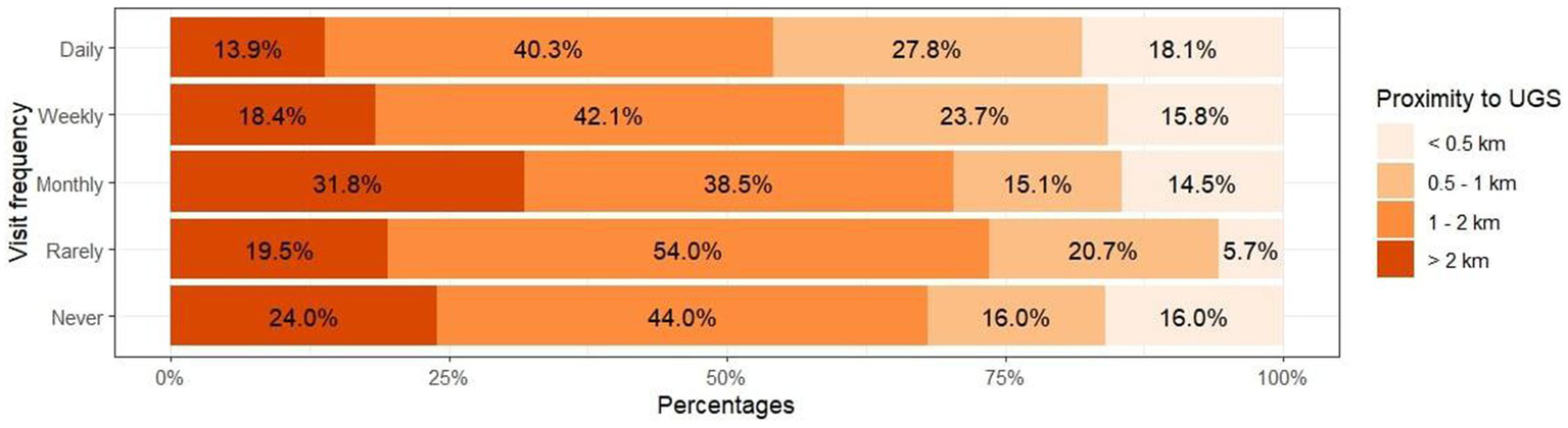This study examined the variation in the frequency of visits to urban green spaces in relation to respondents’ gender, professional status and residential distance. The results showed that the highest frequency of visits was “monthly” (44.64%), followed by “rarely” (21.70%), “daily” (17.96%), “weekly” (9.48%) and “never” (6.23%). Establishing the link between residential distance to a green space and frequency of visits, the study revealed that people living between 1 and 2 km from a green space visit it mostly daily (40.3%), weekly (42.1%), monthly (38.5%) and very occasionally (54%). The most distant respondents, that is, those living over 2 km from a green space, occupied the second place, with monthly frequency dominating. Those living between 0.5 and 1 km away occupy the third position, with daily frequency dominating (Figure 2). Those living close to a green space (< 0.5 km) represented a small percentage of the respondents, and their dominant frequency was daily (18.1%).