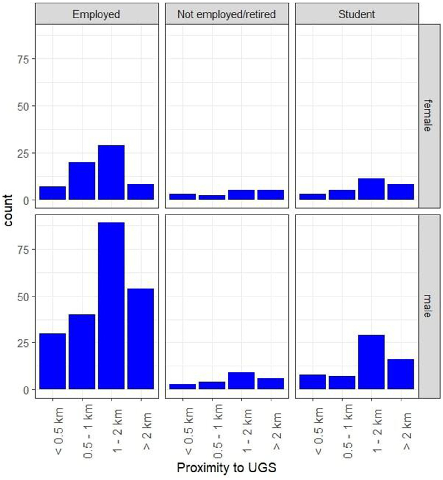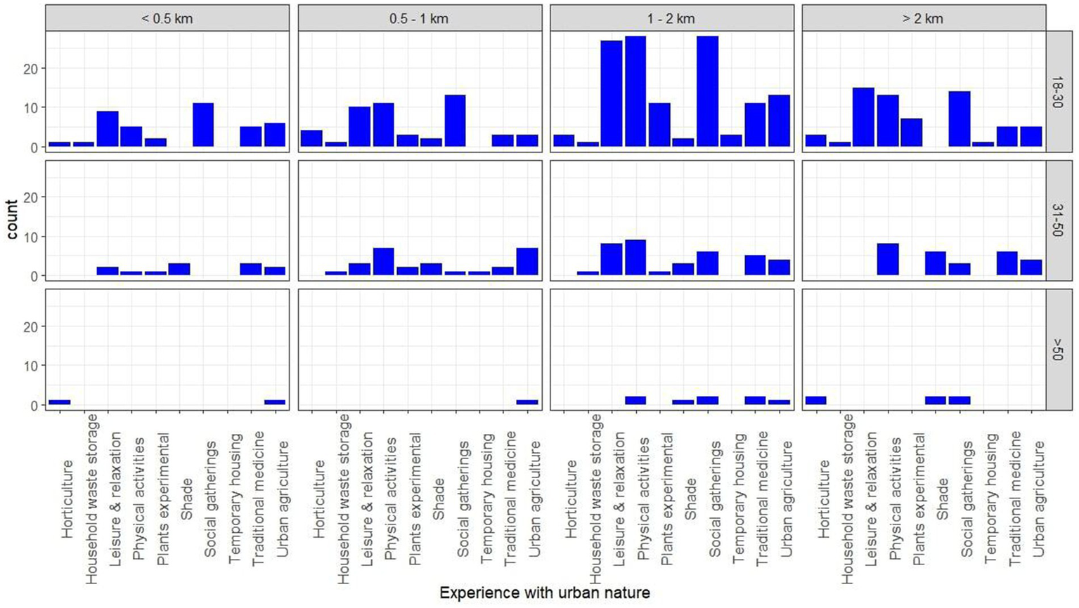 Distribution of respondents’ experiences of urban nature by age and distance from home to green space.