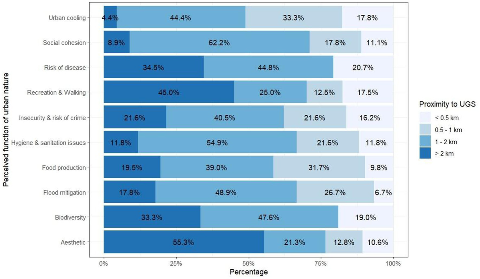 The relationships between perceptions, residential distance to green space, level of education, and gender showed variations. The results indicate that people living <0.5 km from a green space have perceptions of disease risk (20.7%), biodiversity (19%), and urban cooling (17.8%). Although these natural spaces contribute to ecological functioning (water cycle management), urban cooling, and recreational activities, they are also perceived as having a positive impact on the environment. However, they considered that these spaces present a risk for diseases such as malaria due to mosquitoes, hygiene and sanitation problems, insecurity, and crime (Figure 4). For example, one participant involved in this study said that trees help to recycle water run-off and that many more need to be planted to reap the benefits (Participant 01). The group interviews also revealed that, in the context of the city of Ouagadougou, urban nature cannot be dissociated from waste. This is influenced by local cultures regarding interstitial spaces in the city, in this case nature. For example, one participant argued that in the city of Ouagadougou, greenery is inseparable from dumping grounds, as people still throw solid and plastic waste into nature (Participant 07).