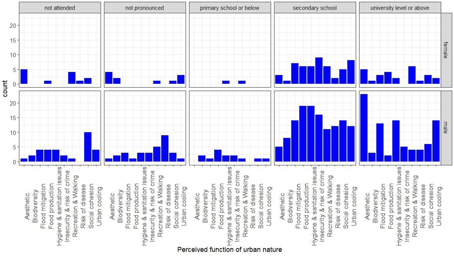 People living at 0.5–1 km mainly associate urban nature with the following benefits too: urban cooling (33.3%), social cohesion (17.4%), food supply (31.7%), and flood management (26.7%). However, they also point to ecosystem domains, such as hygiene and sanitation problems (21.6%) and crime risks (21.6%), that develop around urban natural areas. Indeed, one participant pointed out during the group discussion that the trees that made up urban nature in the city of Ouagadougou were not predominantly fruit trees (Participant 01). Others lamented the fact that natural areas do not offer enough shade, as is the case with the trees in Bangreogo Park, where life is good (Participants 06 and 08). In addition, people living between 1 and 2 km or more than 2 km away had similar perceptions of others. The major difference between respondents living at a distance from a green space and those living elsewhere was their perception of aesthetic value (55.3%). Regarding the level of education, the analysis revealed that ecosystem services and disservices are mainly perceived by individuals with at least secondary education, who are predominantly male (Figure 5).