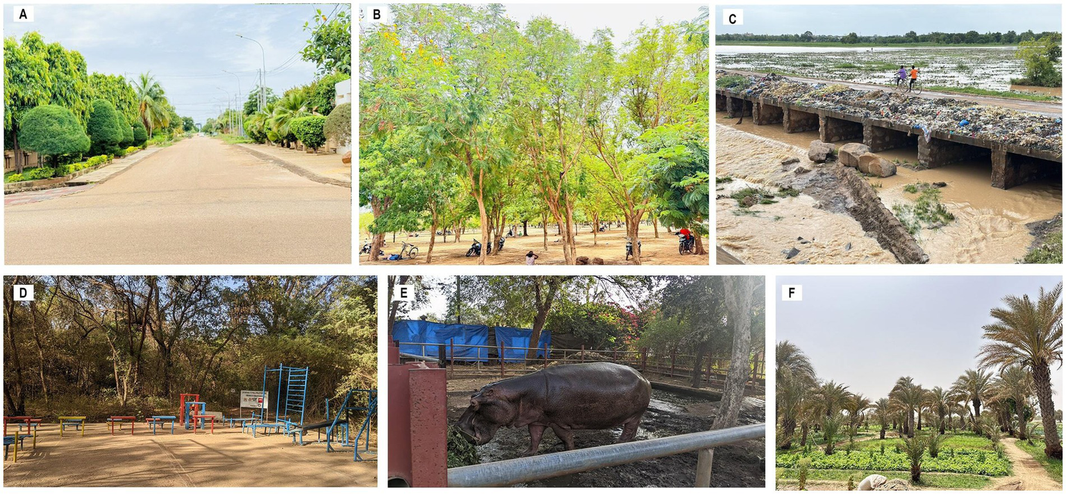 Uses of urban nature. (A) Show hedges with aesthetic value in a residential area. (B) shows the use of trees for shade in hot weather. (C) A road infrastructure and wetland invaded by plastic waste. (D) Illustrates the natural area of Bangrewogo urban park reserved for physical activities. (E) Protected animal zone reserved for visits inside the park. (F) Urban agriculture in natural areas.