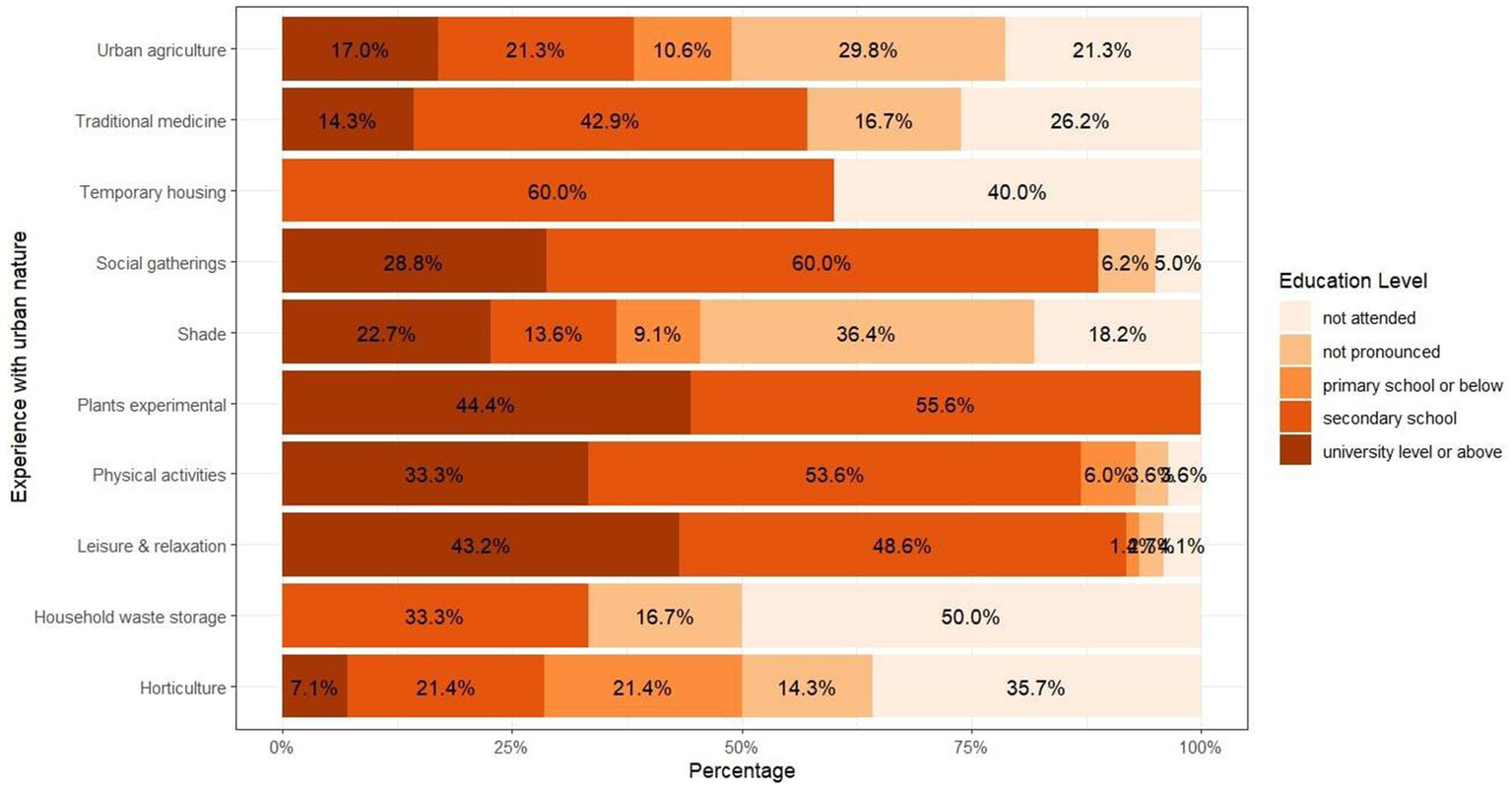 Individuals with primary education or less practiced and experimented with horticulture (21.4%), traditional medicine (16.7%), and urban agriculture (29.8%). Discussions of experiences with urban nature have revealed that nature is a means by which some residents practice collective or private gardens. Others with spiritual culture and beliefs use plants in traditional medicine. This experience is supported by the discussions, and to this end, one participant pointed out that he had already used herbal tea to heal himself (Participant 13).