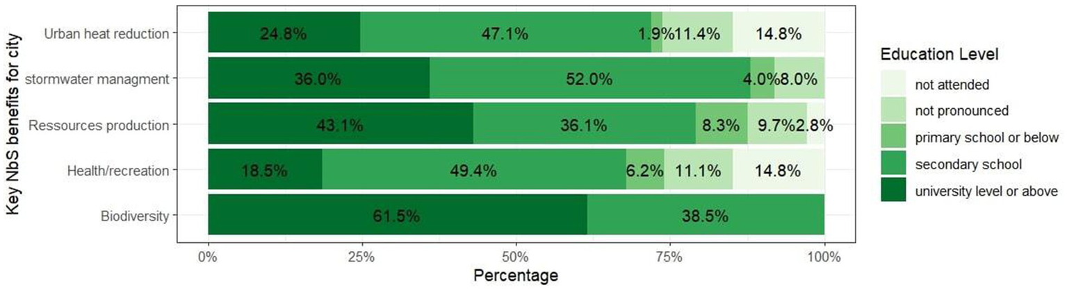 To successfully implement nature-based solutions in cities, it is important to consider several factors, including political, social, ecological, and economic, or more generally, anthropogenic conditions (Ferret and Laurans, 2020). This study examined how residents perceive the benefits of nature-based solutions. It emerges that people at the university level and above consider support for natural and wild habitats, including the maintenance of urban biodiversity (61.5%), the production of natural resources (43.1%), and stormwater management (36%) for urban flood risk reduction, as the main benefits of nature-based solutions (Figure 9). People with a secondary education had perceptions similar to those above. These benefits represent 52.0% for stormwater management, 50.6% for health/recreation, and 47.1% for heat island reduction.