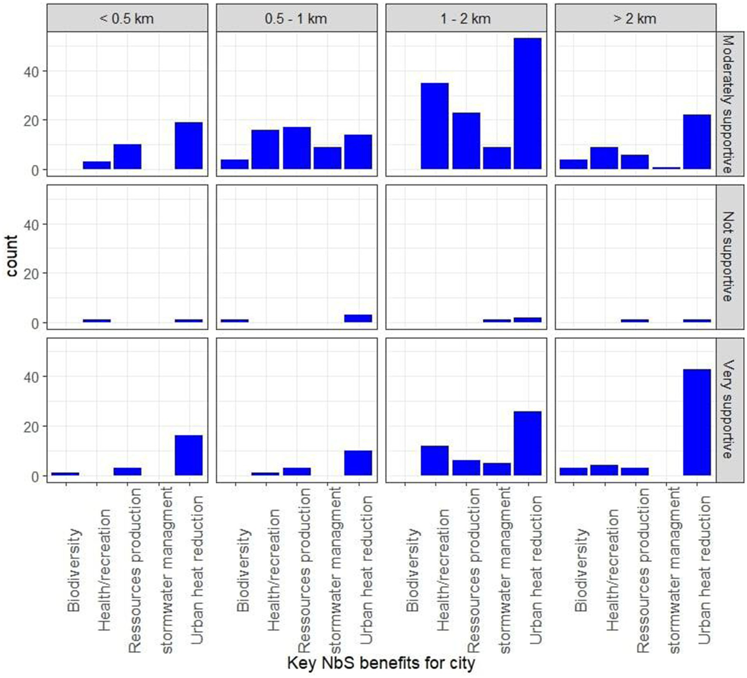 Frequency distribution of the main benefits of nature-based solutions according to the level of support for NbS and the distance between home and green space.