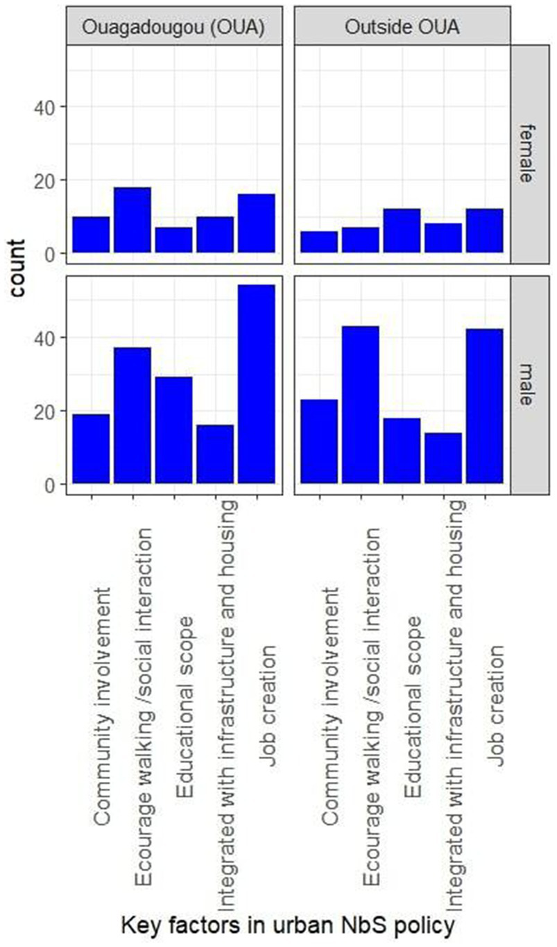 Regarding the factors to be considered for the political success of NbS in urban environments, participants who were born in Ouagadougou (OUA) or outside OUA, prioritized the creation of green jobs, actions encouraging walking, social interaction, and education, and community involvement as elements (Figure 11). People are unaware of the technical and ecological aspects of the integrating of urban infrastructure and housing development.