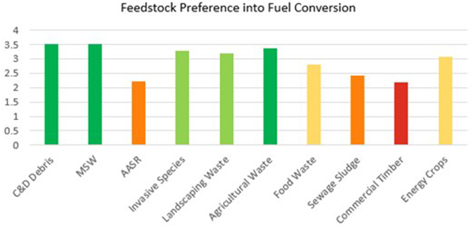 Figure 2 shows the combined responses (n = 160) for the question, “The materials listed below can be converted into fuel and recycled material products. Select your preference for each material.” Construction and demolition debris (C&D) ranked the highest as most desirable, closely followed by municipal solid waste (MSW), and agricultural waste for conversion to energy and recycled-material products. The least desirable feedstock ranked was automobile and appliance shredder residue (AASR) and sewage sludge.