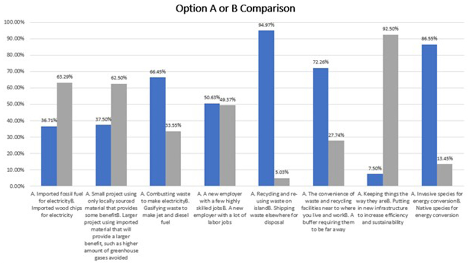 Finally, participants were asked to weigh the benefits or tradeoffs between distinct types of waste-to-energy projects to determine preferences when there was no perfect choice (Table 1). A few of the choices, such as recycling waste on the island and investing in new infrastructure to increase sustainability, were clear winners confirming ideas about preference for these choices, especially within the native Hawaiian community. Preferences such as these results make the proposed feedstock bioenergy project more agreeable to the local community and at less risk of negative pushback. Surprisingly, the results display a greater preference to larger projects with greater benefits as compared to smaller local projects. This contrasted the information gathered from case studies that found communities tended to be more opposed to larger “mainland-style” projects and seemed to prefer smaller projects that kept activities at the local community scale. Additionally, many of the community residents who reside in the same area of the current landfill are opposed to its expansion and continued operations, most of the respondents still opted for the convenience of having a waste facility nearby. Also worth noting during the community surveys and stakeholder interviews, there was strong sensitivity to certain technical terms. For example, when asked to choose between “combustion” and “gasification” of waste, respondents preferred “combustion.” In another version of the same question, the word “burning” instead of “combusting” was used and got the opposite response. Respondents preferred “gasification” to “burning” by a margin of 3 to 1. These results indicate that more education may be required to better inform the communities about the processes and how they compare to more familiar technologies.