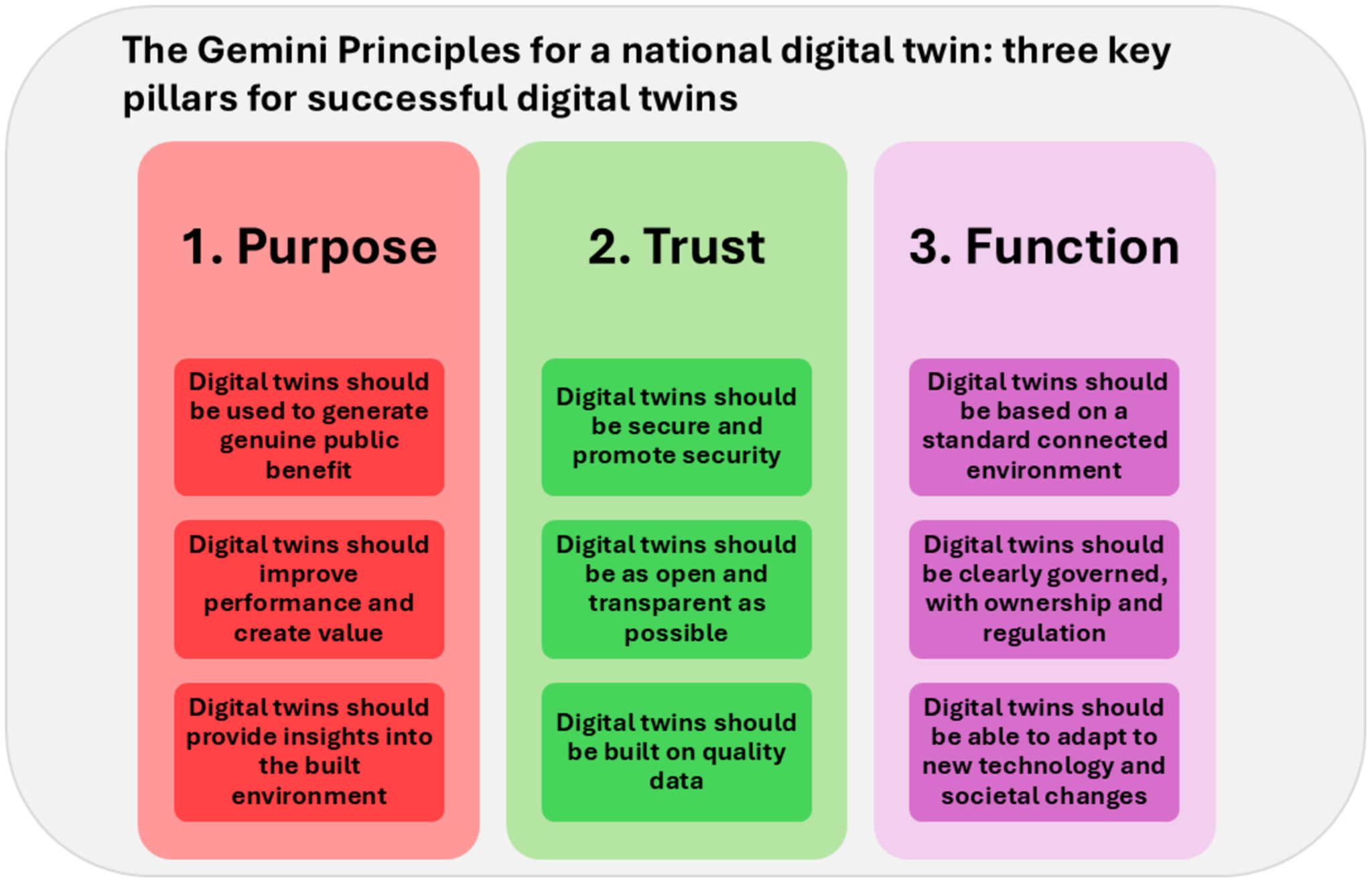 There are significant challenges facing the NDTP; fundamentally around the utilisation of large datasets. When integrating data from multiple sources, the metadata becomes as important as the data itself. It is important to consider factors such as who owns the data at each stage, how the data is protected, what computational power is required to process and store such data and are datasets interoperable. Away from technical questions, there are also ethical challenges around big data usage, ensuring that data does not further inequality and is not bias towards certain populations is one challenge. Another comes in the form of the collection and security of sensitive data that is integral to multi-sector digital twins (Government Office for Science, 2023). One key advance in this space is the Gemini Principles which set out the key principles needed to build a national digital twin that meets the above promises and considers the challenges highlighted (Centre for Digital Built Britain, 2022). Outlined in Figure 1 below, the Gemini Principles are a tool to ensure that a digital twin framework is purposeful, trustworthy and functional to enable better operability, management and delivery of digital twin assets (Bolton et al., 2018). However, it is not possible to fully apply the Gemini Principles to air quality data sets- sensor networks face challenges around governance, regulation, ownership. The data sets are not yet long term, both due to the life span of sensors frequently being suggested as 1–2 years by manufacturers and the ‘project limited’ mindset in which environmental data is often procured. A further limitation to progress towards the Gemini Principles is the data skills shortage currently experienced in the UK. In 2021, the Department for Education stated that 52% of the workforce for not have the essential digital skills required of modern work (Department for Education, 2021). Without these skills, it is unlikely that data will be suitable to progress towards a digital twin, nor will the workforce be able to develop and integrate digital twin technology readily into decision making processes. Given the scale of the research required, a national digital twin remains a long-term ambition. Progress will comprise of building blocks of much smaller digital twins—perhaps for a particular sector, location or use-case, which can later be integrated as bigger connected twin.