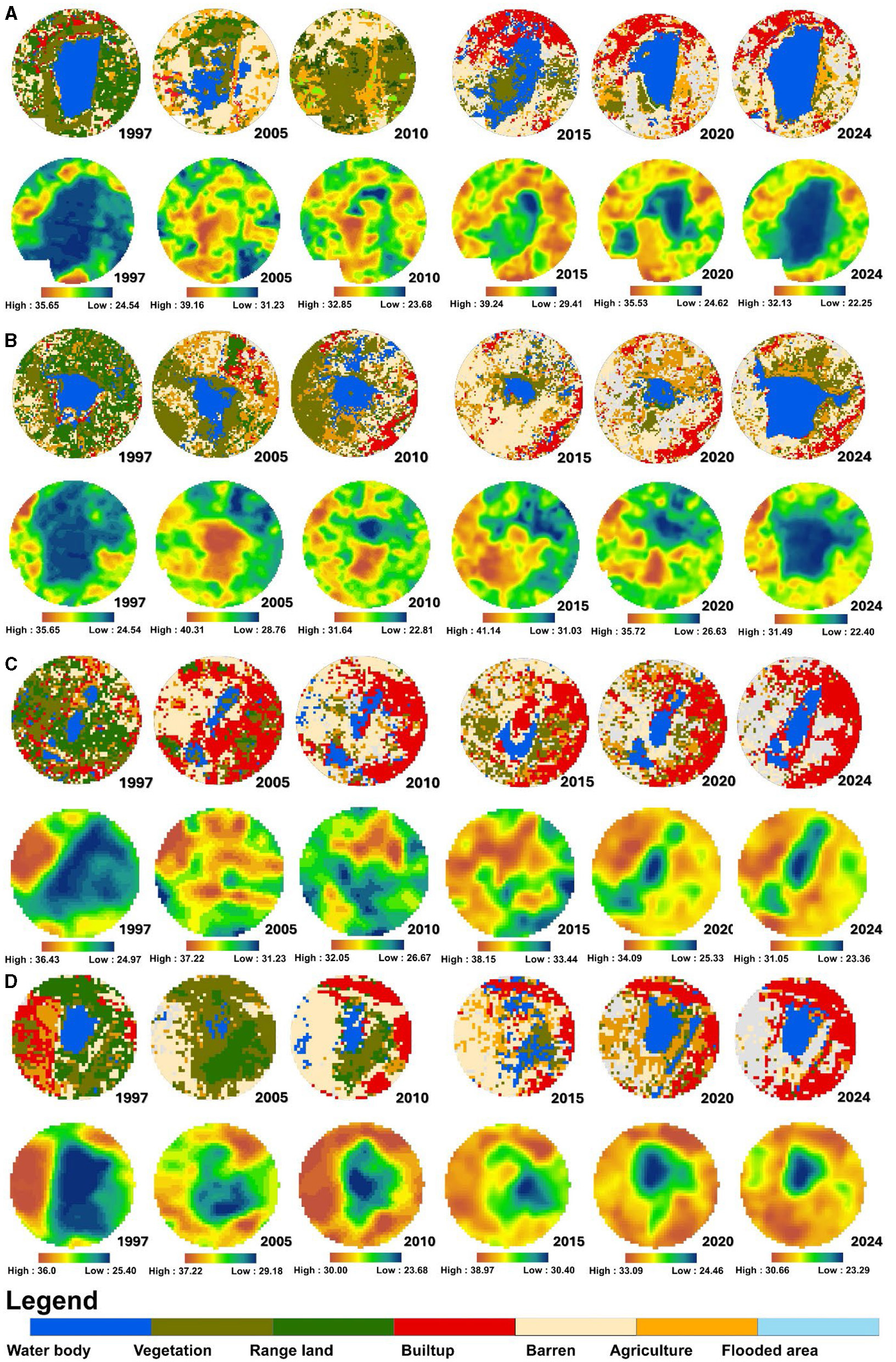 land surface temperature, land use pattern, urban heat intensity, water spread areas, multivariate correlation and regression