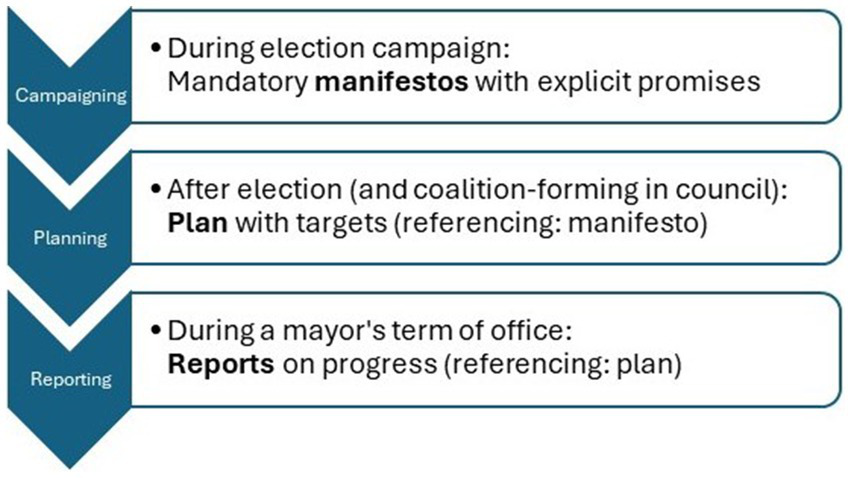 The trend towards voluntary, non-binding goal-setting arrangements in (inter) national sustainability governance contrasts with an alternative development that also originated in the 1990s and gained prominence in Latin America. In 1994, Colombia introduced legal obligations for mayors to be held accountable for election promises and goal achievement in office; non-compliance or under-performance may trigger recalls. As depicted in Figure 1, this accountability mechanism addresses the electoral-administrative cycle by requiring candidates to write explicit manifestos, elected mayors to formalise plans with goals, and mayors to report on goal achievement.