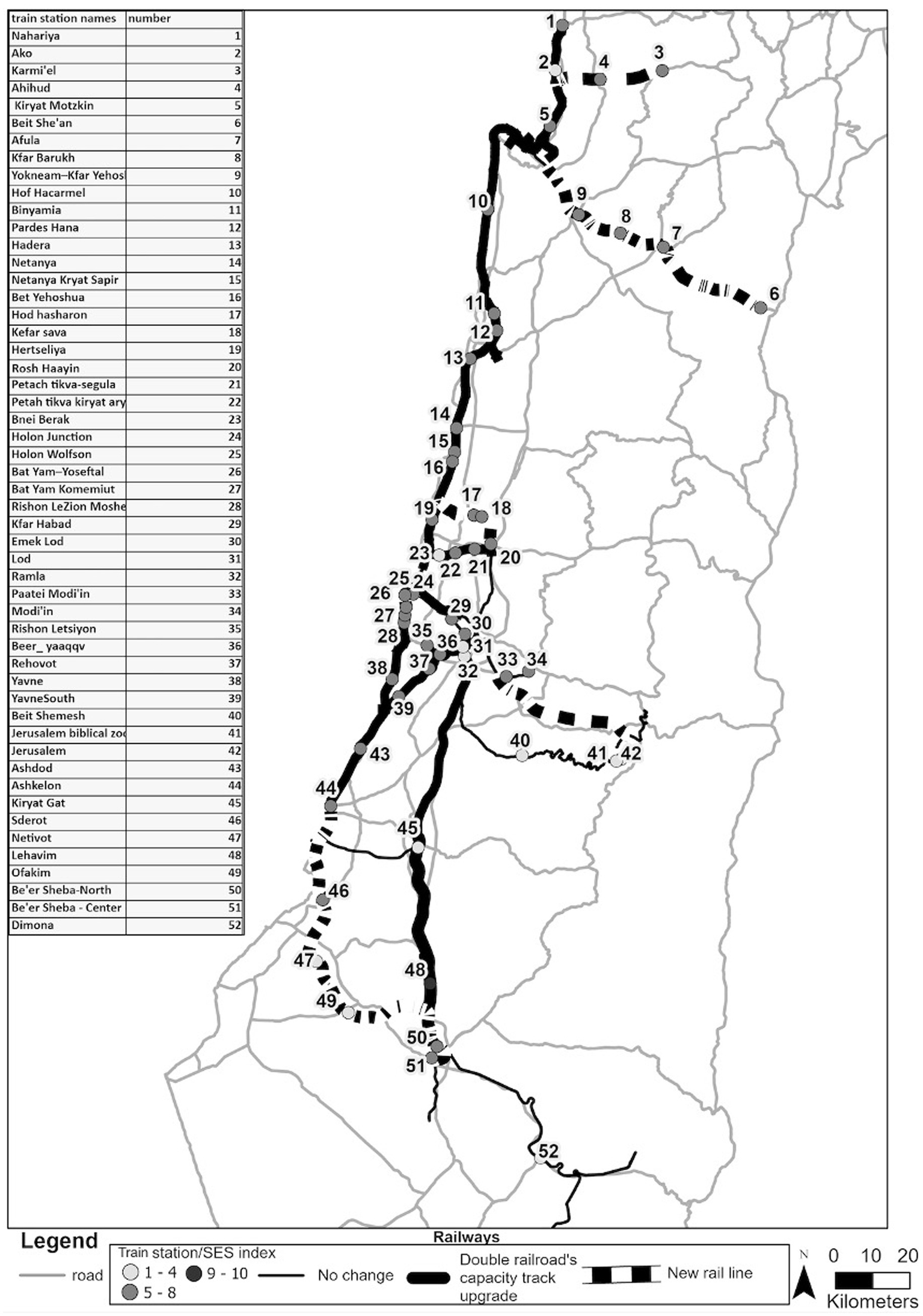 In Israel, only a limited number of cities contain train stations inside the city and adjacent to residential areas. Most passengers, thus, require a motorized means of transportation to access the train station, since walking is infeasible, and due to the absence of bicycle paths, so is cycling. For the disadvantaged strata of society not residing within walking or cycling distance, such access largely relies on the level of service of feeder bus lines. Therefore, to examine the attributes of the potential beneficiaries of the enhanced rail services, a two-stage analysis was conducted. First, the towns in which, or near which, rail stations are located were classified according to two criteria: the town’s socio-economic ranking; and the town’s ethnic composition. Then, the bus services to each of the 61 rail stations serviced at the end of 2016 were analyzed, focusing on the demographics of those residing near the bus stops.