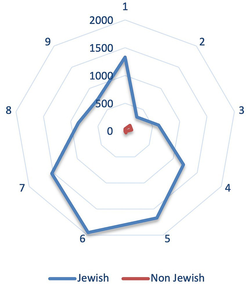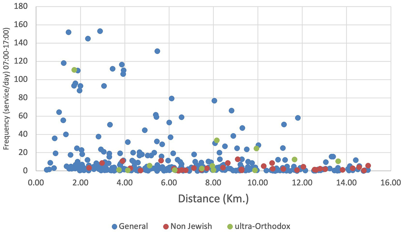 In the final stage, an Excel spreadsheet was consolidated for each city containing the following travel data: bus line number, destination city, distance in meters, and total frequency of travel (calculated according to the sum of feeder bus lines during the relevant period). We narrowed the number of cities down using a criterion of distance from a train station. Only cities located within 15 km of a train station were selected, and tagged according to their non-Jewish, ultra-Orthodox, and general (Jewish) populations.
