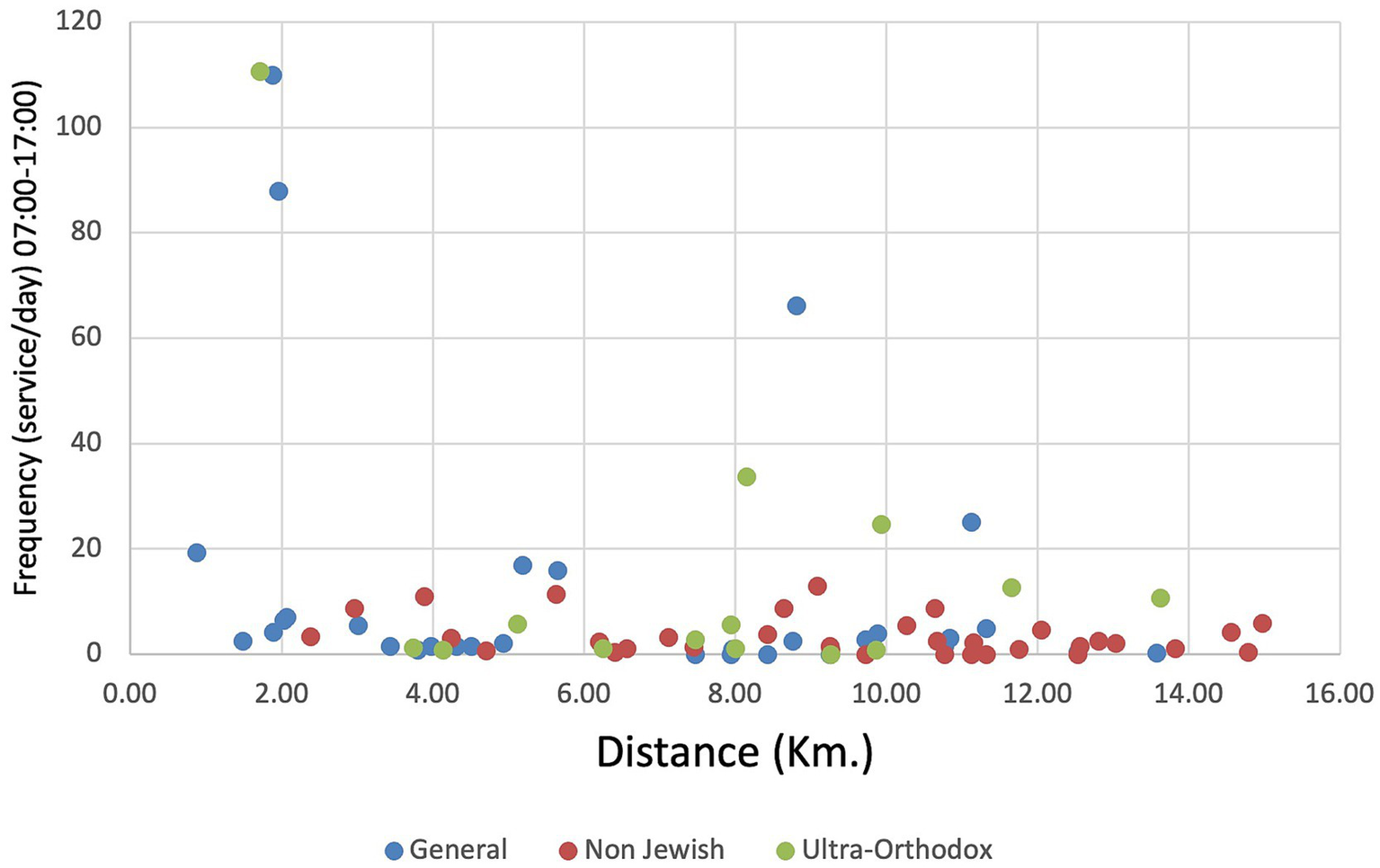 However, accessibility is not merely a question of the presence of bus stops. To evaluate accessibility, distance and frequency of service must both be considered. To this end, distance from towns (centroid) to rail stations, as well as frequency of bus services were calculated. Figure 3 depicts accessibility of bus feeder lines to rail stations for all towns within a maximum distance of 15 km. Towns were clustered into three groups, based on the majority population of each town: general Jewish population, ultra-Orthodox population, and non-Jewish population. As indicated by Figure 2, it is largely general Jewish locales that enjoy high accessibility, namely cities and towns within 5 kilometers of a rail station, and with a service frequency of over 80 buses per day. Only one ultra-Orthodox town lies in the high accessibility cluster: Netivot. Located in southern Israel, its distance from a train station is 1.71 kilometers, with a bus frequency of about 110 buses per day.