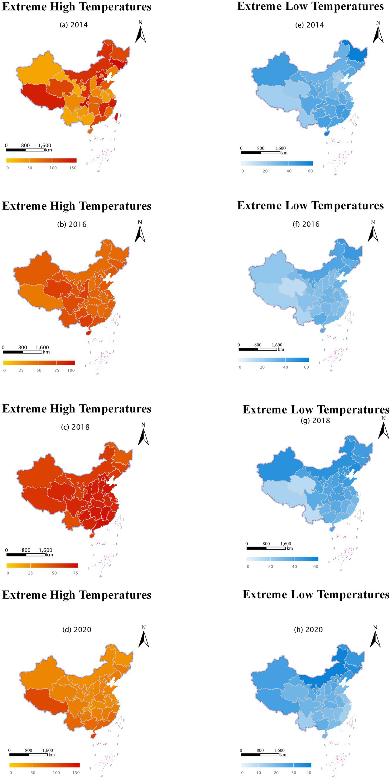 Figure 1 illustrates the spatial distribution and temporal dynamics of extreme temperatures in China for the years 2014, 2016, 2018, and 2020. As depicted, remote areas in China exhibit a higher frequency of extreme temperatures, corroborating the findings of Huang et al. (2014).