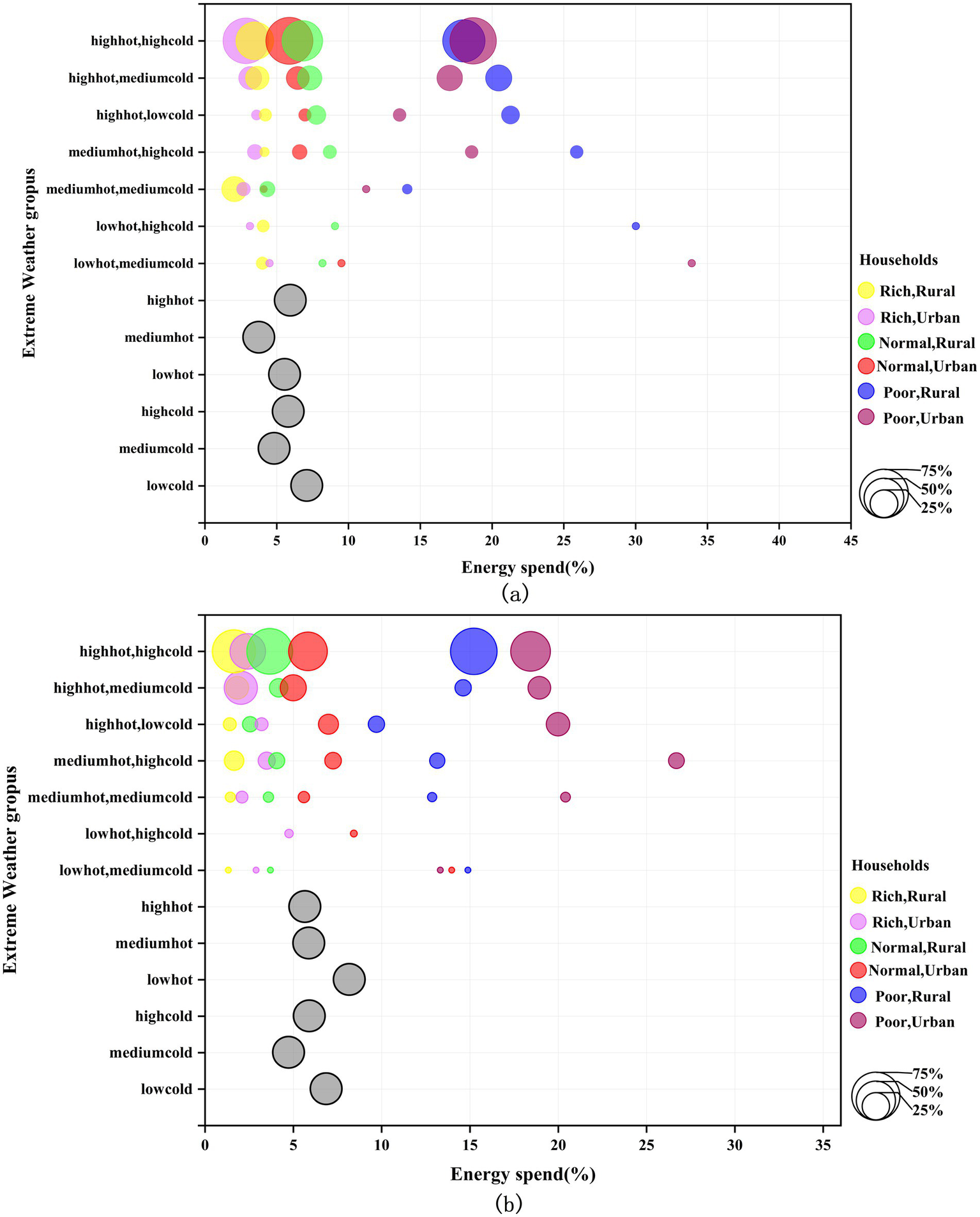 The severity of impacts from extreme events is determined not only by the events themselves but also by exposure and vulnerability (IPCC, 2012, 2021). Therefore, the extent to which extreme temperatures affect household energy consumption may vary based on household income levels, urban or rural status, and geographic location. The Energy Ladder Hypothesis suggests that income primarily influences energy consumption structure, with higher incomes facilitating a shift from traditional to cleaner, more efficient, low-carbon energy sources (Hosier and Dowd, 1987). Due to budget and wealth constraints, most low-income households cannot quickly transition to a low-carbon consumption pattern, making them more susceptible to extreme temperatures. The cost of managing extreme temperatures can be unaffordable for low-income households (Hernandez, 2016). For instance, in Greece, the heating and cooling burden for low-income households is nearly double that of wealthier ones (Santamouris et al., 2014). Adapting to extreme temperatures requires households to reallocate resources to cooling or heating expenses, leading to energy poverty. Households lacking emergency savings and reliant on credit may be particularly sensitive to unusually high energy bills (Doremus et al., 2022). Studies have shown that low-income populations struggle to meet their specific energy needs in extreme temperatures (Bhattacharya et al., 2003), resulting in indoor environments that fail to meet comfortable and healthy standards (Santamouris and Kolokotsa, 2015). Extreme temperatures not only exacerbate the energy poverty gap among households with varying incomes (Beatty et al., 2014) but also create disparities in expenditures on essentials like food (Doremus et al., 2022) and mortality rates (Chirakijja et al., 2019).