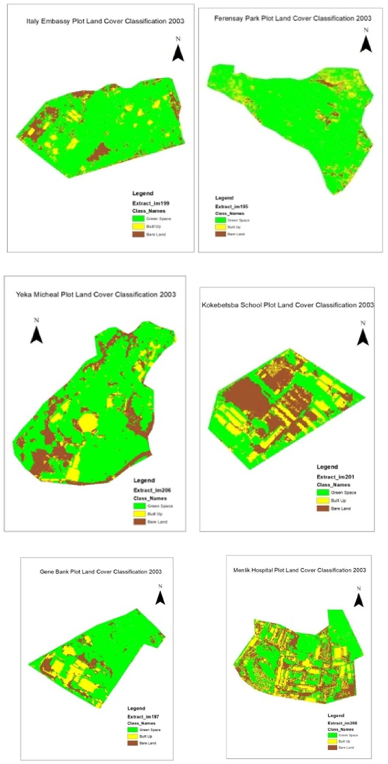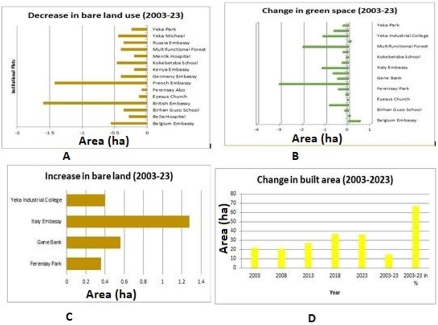 Over the 20-year period from 2003 to 2023, a consistent reduction in green space was observed across the institutional plots in Yeka Sub-City. Table 1 summarizes the changes in green space area for each institutional plot at five-year intervals. Overall, green space decreased by approximately 10.86 hectares, equivalent to an 8% reduction. The decrease was most notable in embassy compounds and government facilities, while some plots, such as certain educational institutions, managed to retain or minimally reduce their green areas.