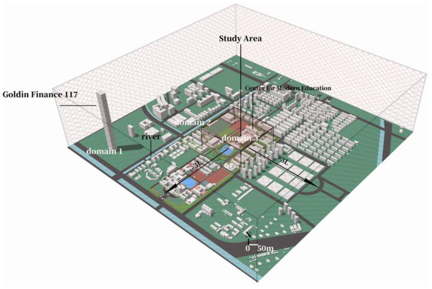 Through mapping, the square and the surrounding area are modeled in 3D at a scale of 0.1 m resolution in the study area, with detailed references to reality in terms of the scale and material properties of the landscape elements (Figure 2). To retain the simulation of the surrounding urban environment, a rectangle centered on the study object and extending to 2,070 × 2,078 m in all directions is the modeling domain. The software uses Cartesian meshing for local optimization, enavling a finer mesh to be applied to a specific part or location, reducing memory consumption and computation time. Automatic meshing with tetrahedral or hexahedral cells using Cutcell and finite element modeling. Based on the size of the computational domain and the square, a three-layer square was used for meshing: