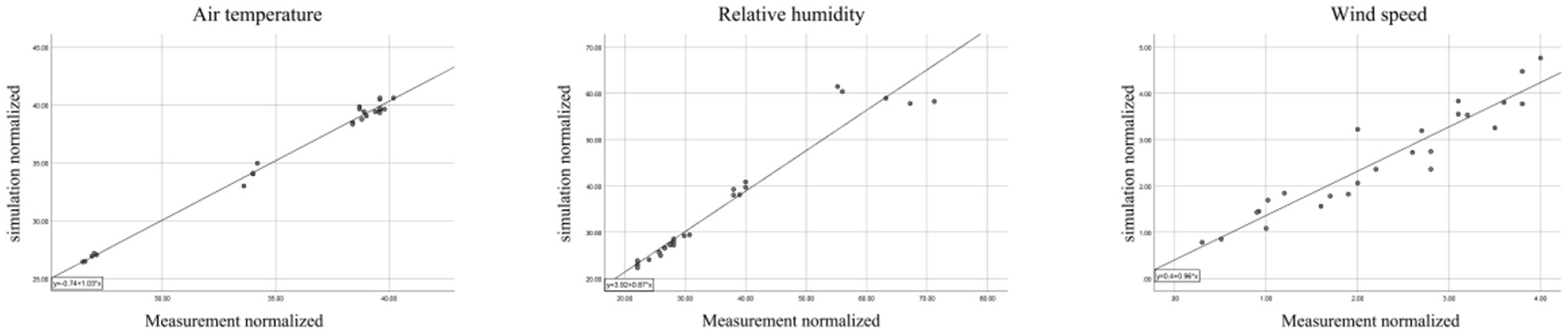 where Xobs is the measured value, Xmodel is the simulated value, and n is the number of data blocks. The average correlation coefficient (R2) = 0.993, root mean square error (RMSE) = 0.373°C, and mean absolute error (MAE) = 0.306°C for the temperature at each measurement point. Mean correlation coefficient (R2) for humidity = 0.942, root mean square error (RMSE) = 3.7%, and mean absolute error (MAE) = 1.9%. The mean correlation coefficient (R2) = 0.892, root mean square error (RMSE) = 0.523 m/s and mean absolute error (MAE) = 0.378 m/s for wind speed (Figure 3). Compared with the temperature and humidity, the wind speed error is relatively large but within the error tolerance, analyzing the reason for this is that the status quo point of plant growth is poor, the simulation for plant growth is good conditions, resulting in part of the point of the wind by the plant canopy obstruction caused by the value of the low. The results indicate that the error falls within the normal range, thereby verifying the credibility of the microclimate simulation.