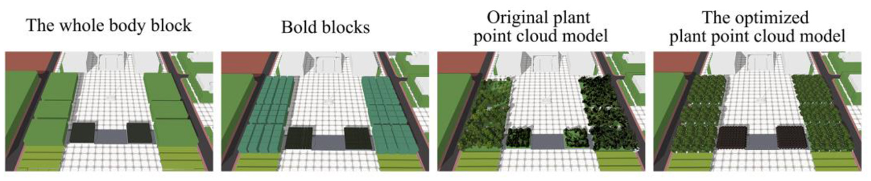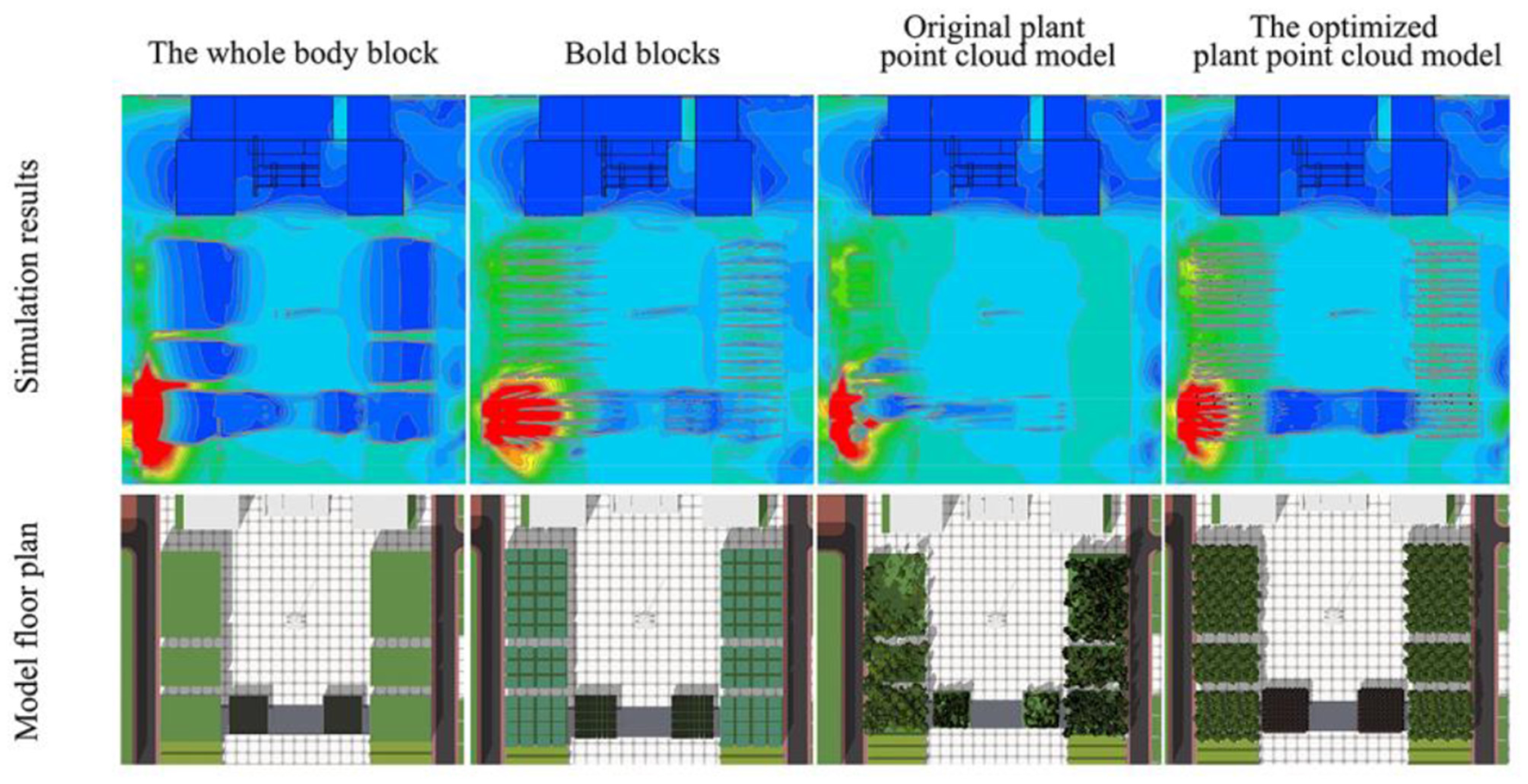 The feasibility of plant point cloud modeling was verified by comparing the wind environment maps generated by point cloud modeling and those obtained from plant coarse modeling The simulations were carried out using the original plant block (the square plants were divided into eight groups of blocks), the original plant coarse block (the square plants were modeled according to the distribution of the square plants using the rectangular block), the modified original plant point cloud model (a decent modification of some parts of the square plant point cloud model), and the optimized plant point cloud model (a well-grown tree was chosen to replace all the trees at all locations; Figure 4). Other conditions remain unchanged. As shown in Figure 5, the modified point cloud model is more effective at simulating the current environment because the reconstructed plants exhibit more morphological characteristics than the real plants, especially in the wind environment, which is an important condition for the microclimate. The optimized plant point cloud model may differ from the measured values of the current weather station due to inconsistencies with the current situation. Still, as an idealized and standardized plant model, the optimized plant point cloud model was used in the later experiments to explore the relationship between the plants and the microclimate in the square of the main teaching building.