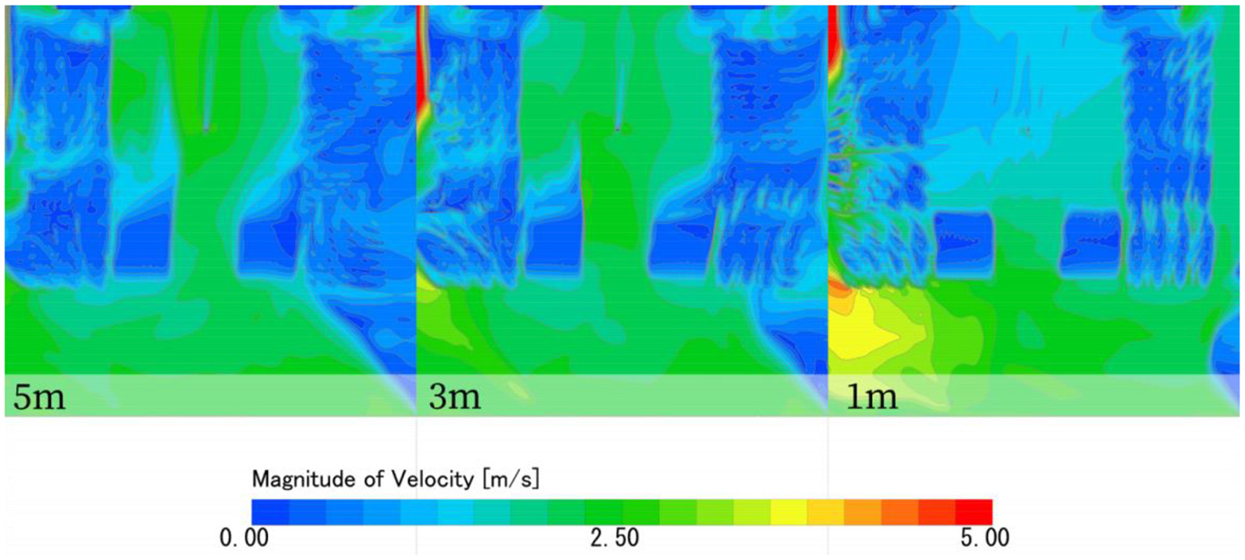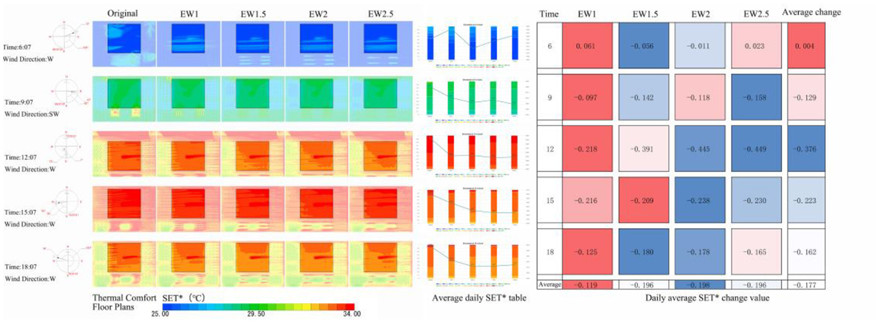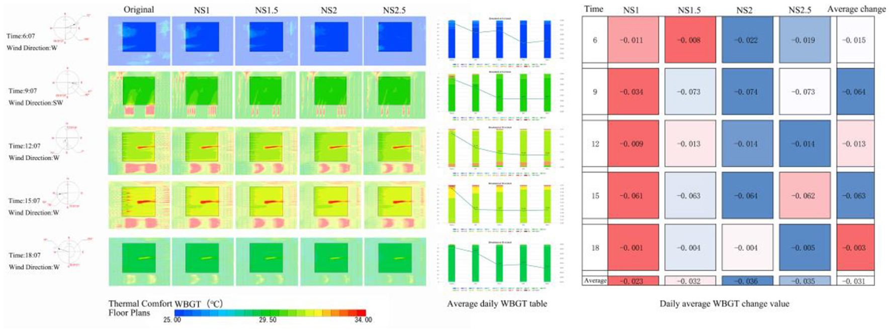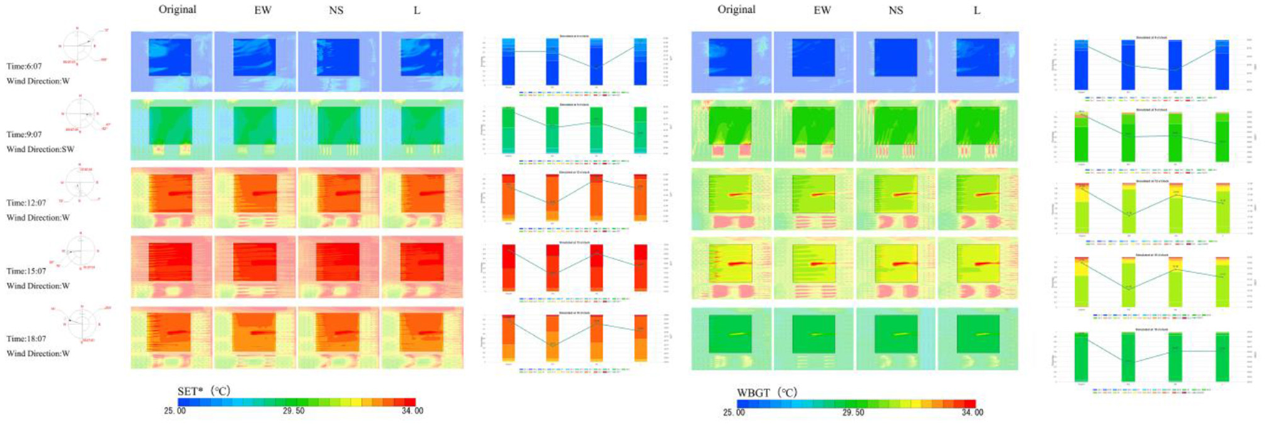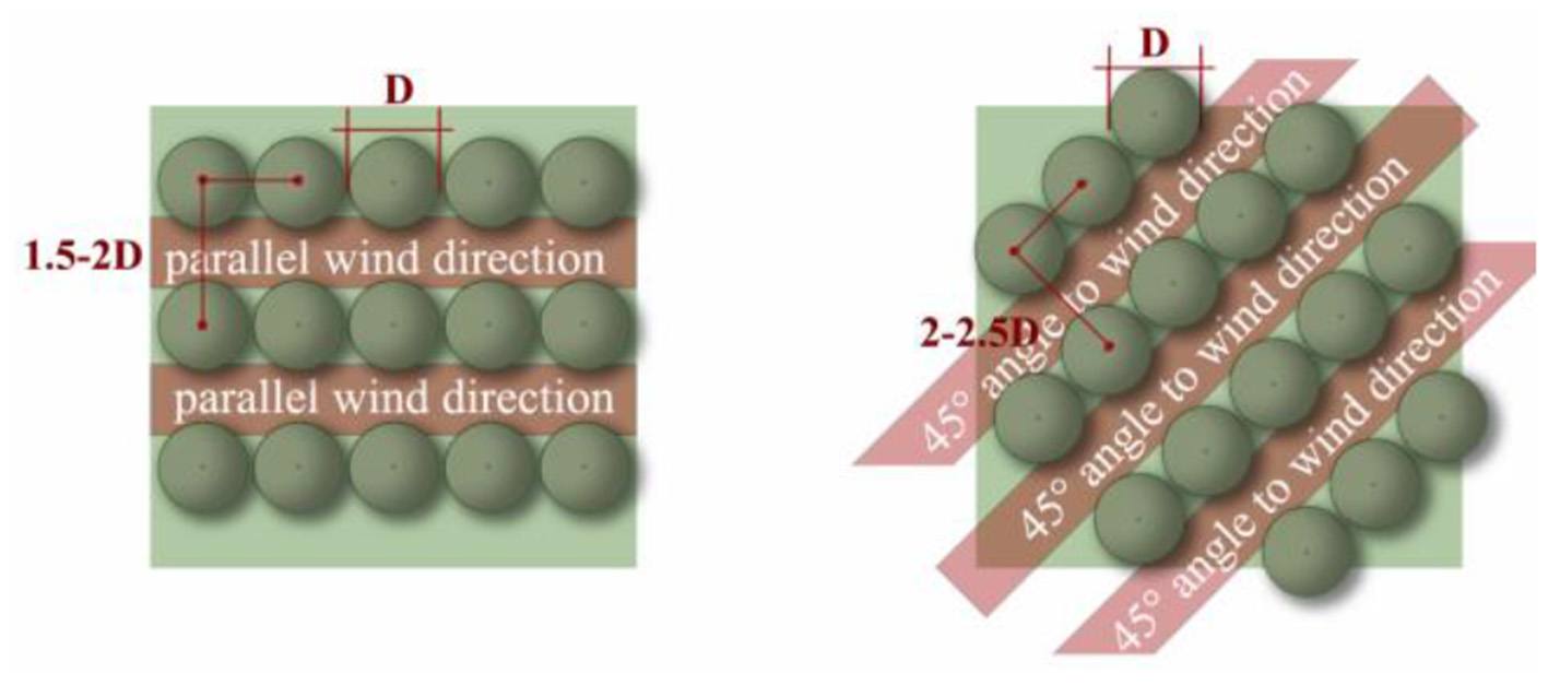 Tree array layout directs the wind environment and thus affects the thermal environment of the site. The wind environment also affects the effectiveness of vegetation in regulating the microclimate. Ribbons of green space parallel to the wind direction have a better cooling effect (Sodoudi et al., 2018); concentrating trees in the center of the site toward the leeward side can provide a more effective cooling effect on the site environment (Hao et al., 2023). It has been shown that the use of upwind tree enclosure to block the summer dominant wind heat wave (Wang et al., 2019), in the downwind enclosure is to break the continuity of the trees, combined with the space under the canopy of the trees in a timely manner to evacuate the hot air generated within the colony can improve the thermal environment around the building. When the spacing of the tree array is denser it can be taken as a whole, the wind speed at the top of the first tree is larger, and the wind speed at the top of the subsequent trees is obviously weakened, and the wind pressure suffered by the tree is also obviously reduced (Xiaoyan et al., 2021).