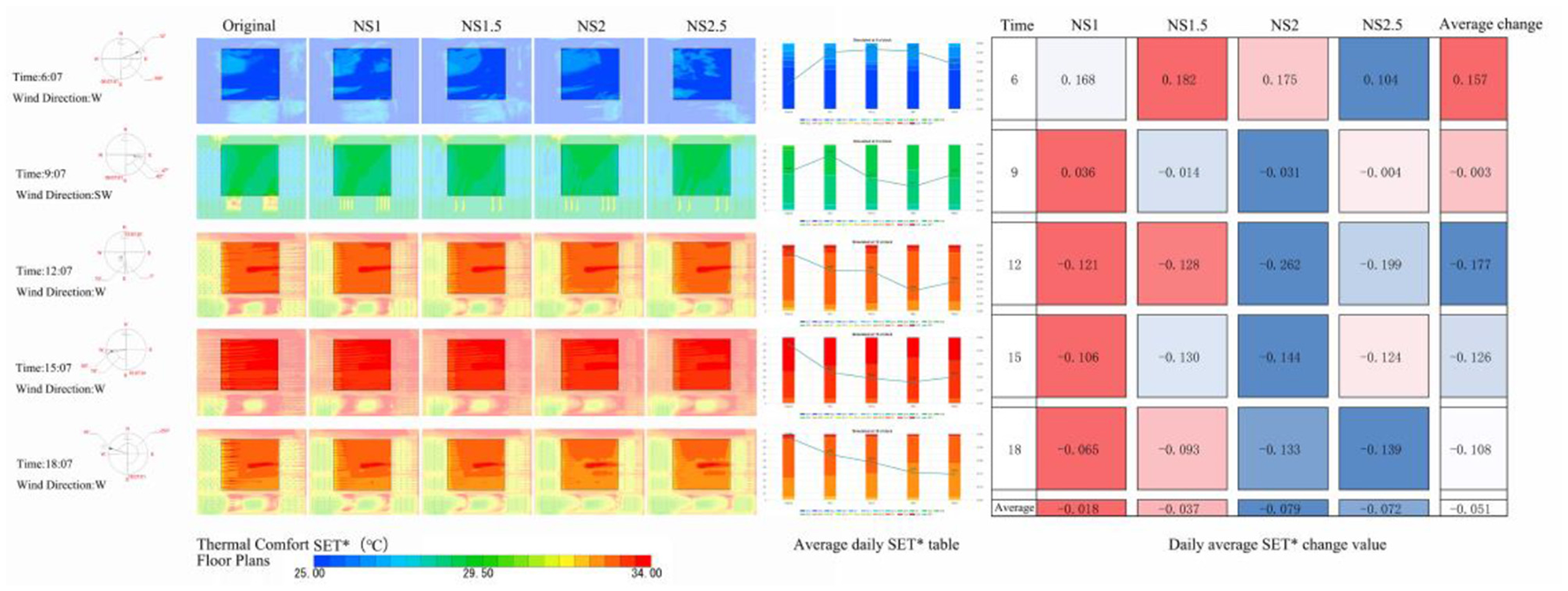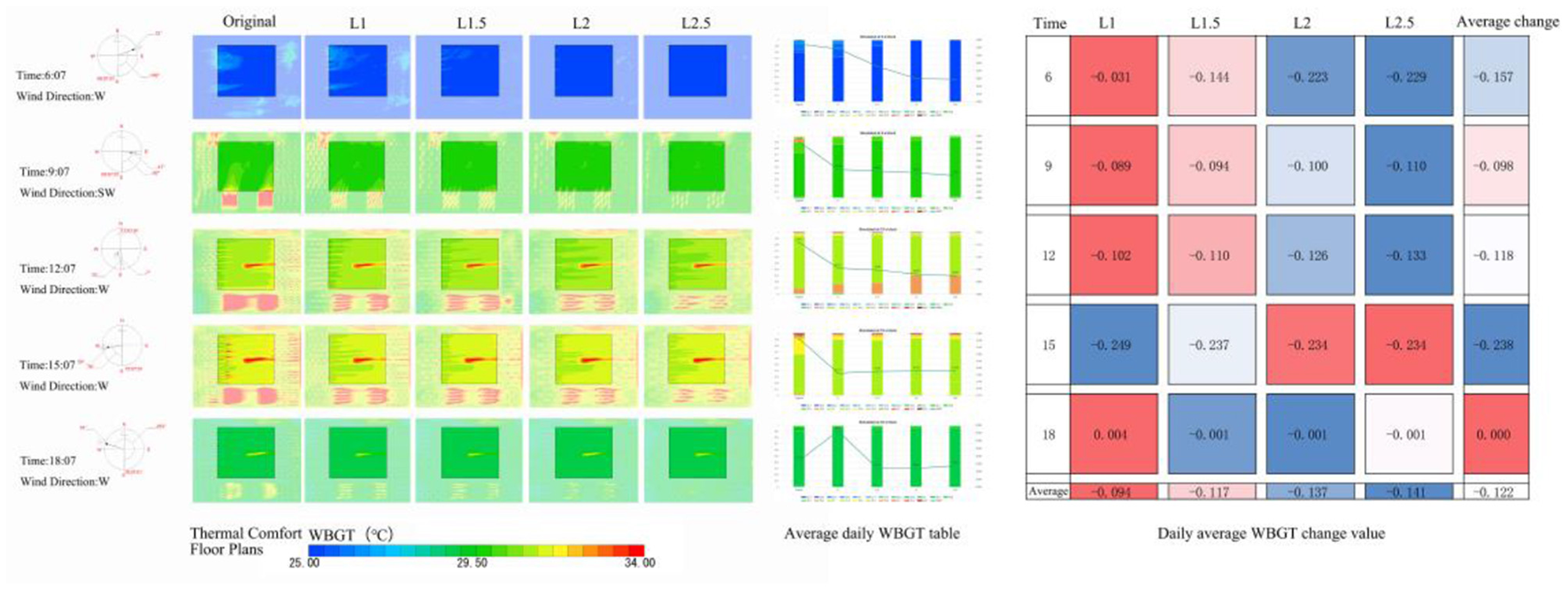The results show that the thermal comfort in different forms can be divided into three levels: (1) when the planting distance is 2.5 times the crown width at an angle of 45° to the wind direction, the thermal comfort effect of the site is optimal (ΔSET*= 0.243°C, ΔWBGT = 0.141°C reduction); (2) when the planting distance is 2 times the crown width parallel to the direction of the prevailing winds in summer, the thermal comfort effect of the site is better (ΔSET*= 0.198°C, ΔWBGT = 0.130°C reduction); (3) when the planting distance is less than 2 times the crown width in the perpendicular wind direction, the thermal comfort effect of the site is the worst (ΔSET*= 0.079°C, ΔWBGT = 0.036°C reduction). This paper intervenes in the point cloud modeling method to provide reference for the subsequent simulation accuracy in this field, and the results of the study have certain reference significance for the design of tree layout when optimizing the thermal comfort environment in this type of main square. In the future, through the integration of real-time meteorological data and multi-scale models, it can dynamically respond to climate change and provide accurate decision support for urban green space system planning, carbon neutral pathway design and extreme weather emergency planning.