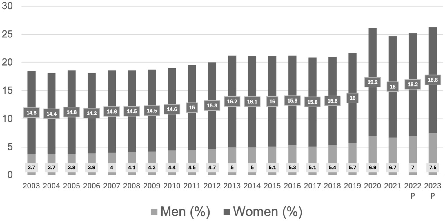For example, as illustrated in Figure 1, Mexican women spent an average of 39.2 h per week performing care and unpaid work (INEGI, 2023). Around two billion hours of care work are performed weekly; of these, only 6% are paid (Heatley, 2022). For the Latin American and Caribbean region, the economic value of these activities represents between 15.7 and 24.2% of regional GDP, and 75% of this value is contributed by women. These gaps are greater in the lowest income quintiles (ECLAC, 2021, 2022c). Figure 2 shows household and care work as percentage of the economy according to the Mexican Satellite Account for unpaid work over the last two decades. In Mexico it has been estimated that care activities and unpaid work represent 24.3% of GDP (INEGI, 2023). According to INEGI data, in 2023, women in Mexico performed 72.4% of these activities, compared to 27.5% that were performed by men.