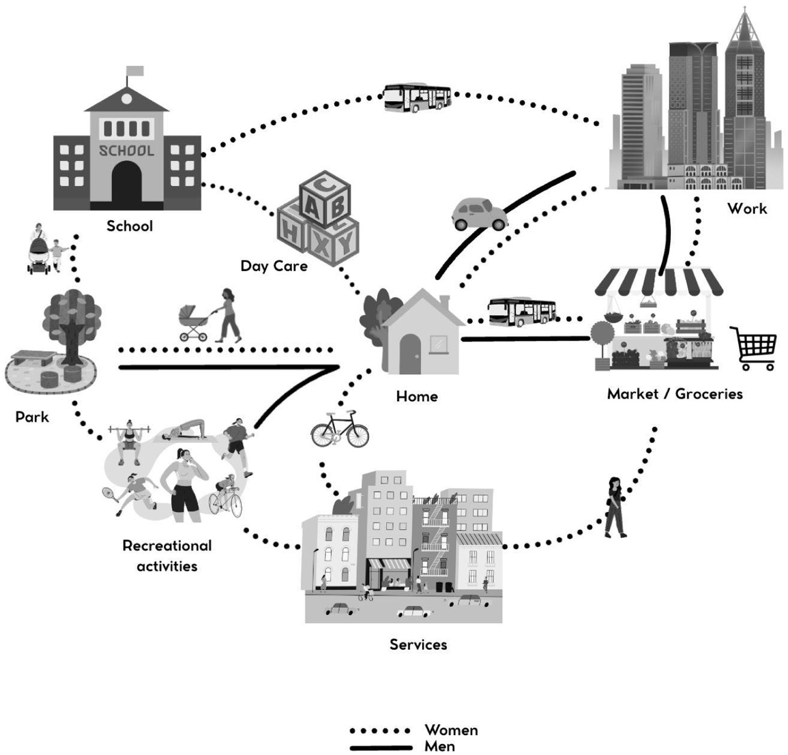 In the early 2000s, Sánchez de Madariaga (2004a,b, 2009) translated into the sphere of urban and particularly in transportation planning the conceptualization of care as work that had been developed by feminist economists, by introducing the ideas of “mobility of care” and “urbanism of care,” to refer to an approach to urban and transportation planning that would contribute to creating the spatial and physical conditions necessary to support care activities. Such conceptualizations of urbanism and mobility of care overcome traditional visions of urban realities based on the dichotomy between the productive and reproductive spheres, by appropriately supporting the care work essential for the reproduction of society and for sustaining life and the economy.