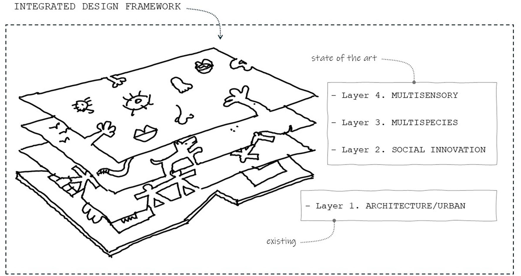 Integrated design framework. Integrated future solutions are multi-layered i.e., they combine architecture and urban design with social innovation, multisensory analysis, more-than-human and multispecies design.