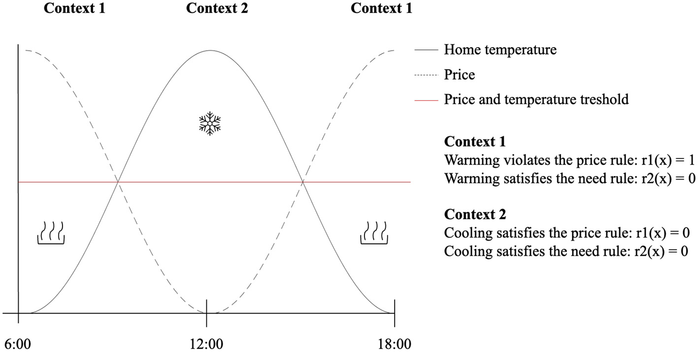 In cold climates, assuming a dynamic pricing scheme, rules r1 (the price rule) and r2 (the need rule) described in the introduction are naturally in conflict depending on the time of the day, or energetic “context”. In the morning, the temperature of the house is lower, and the price of energy is higher, as the population demand on the power grid is higher (Figure 1, context 1). In the afternoon, as the sun warms the house and the environment—and as people leave the house to go to work and demand on appliances reduces—the demand on the power grid falls and prices reduce (Figure 1, context 2). This is so, despite the need for cooling down houses as the afternoon temperature rises. In the afternoon, r1 and r2 are not in conflict. Then, in the evening, as the demand for energy and the need to warm up the house kick back in, r1 and r2 enter in conflict again, as homeowners may want to respect their price threshold while meeting their needs (e.g., warming up the house). This pattern is described in Figure 1.