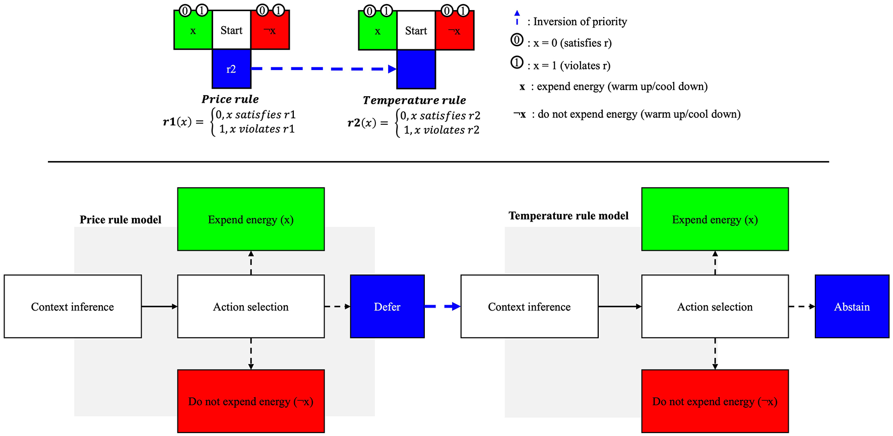 Our simulations implement the rulebook formalism using the T-maze paradigm by allowing the agent to reverse the base priority when unsure about action selection. This involves using two T-maze agents (or one agent with two states of mind), each parameterized to comply with the two rules r1 (price rule) or r2 (temperature rule). Crucially, one of the T-mazes “defers” to the other when opting for the “cue” option (lower arm) instead of deciding to expend energy (left arm) or not (right arm). In our simulation, we assume that the first rule of the rulebook, r1, has priority over the second rule, r2. The rule r1 is the “price” rule which states that o can satisfy (0) or violate (1) r1 depending on whether the current price of energy is above or below a price threshold set by the homeowner. The second rule, r2, is the temperature rule, which states that o can satisfy (0) or violate (1) r2 depending on whether the temperature of the house is above or below a temperature threshold set by the homeowner (cf. Figure 1).