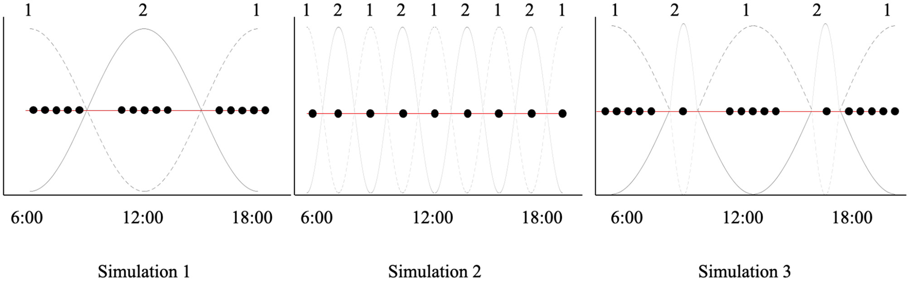 Narratively, the simulations amount to a situation where, in the same 12 h span, from 6am to 6pm, the energetic context relative reflecting the temperature and price conditions would fluctuate with regularity (simulation 1), fluctuate with regularity, but more quickly (simulation 2), and finally would fluctuate with less regularity with varied pace. Conditions 1 and 2 correspond to levels of certainty in the generative process producing the outcomes used by the OCST to infer the right action.
