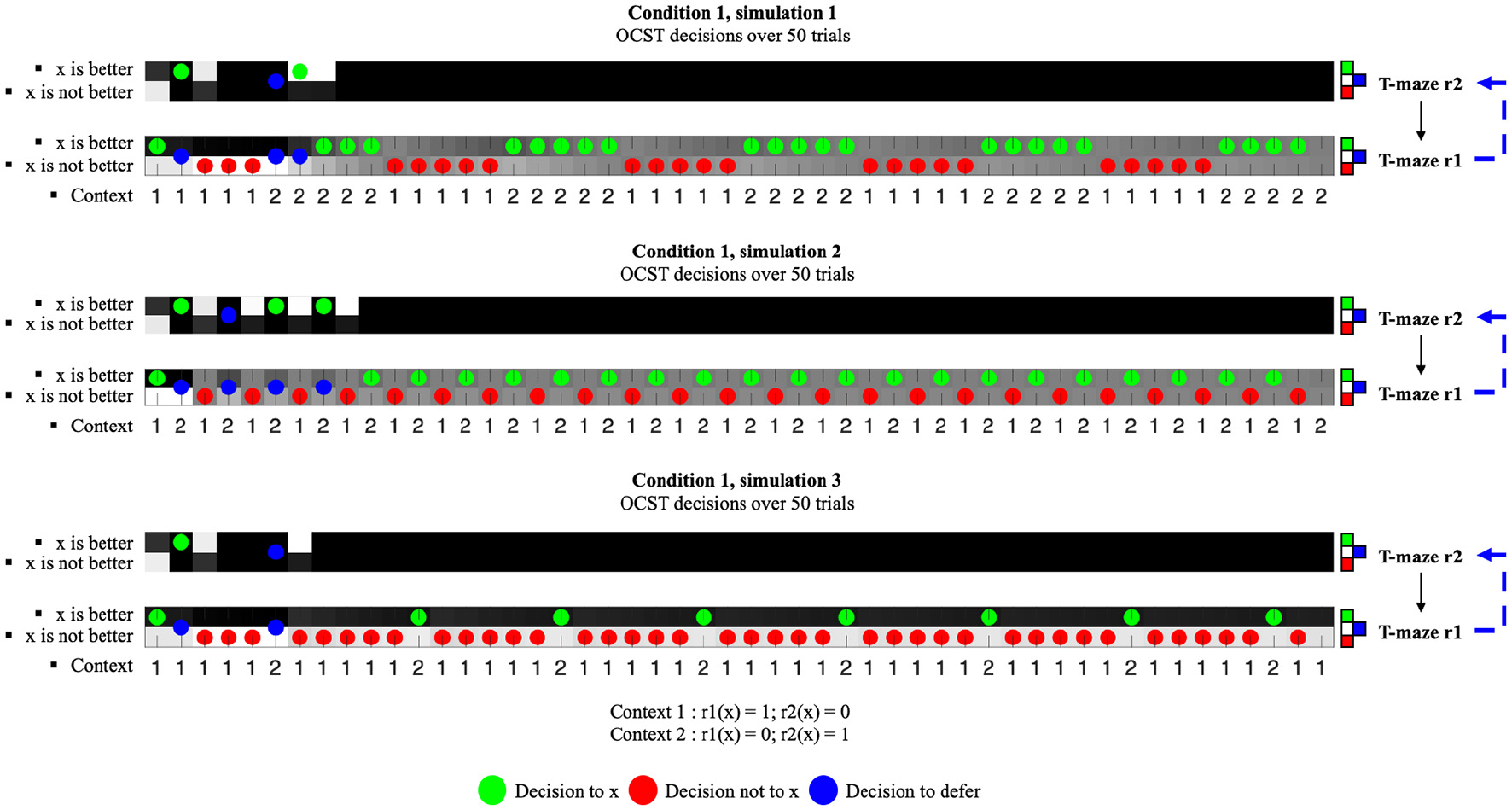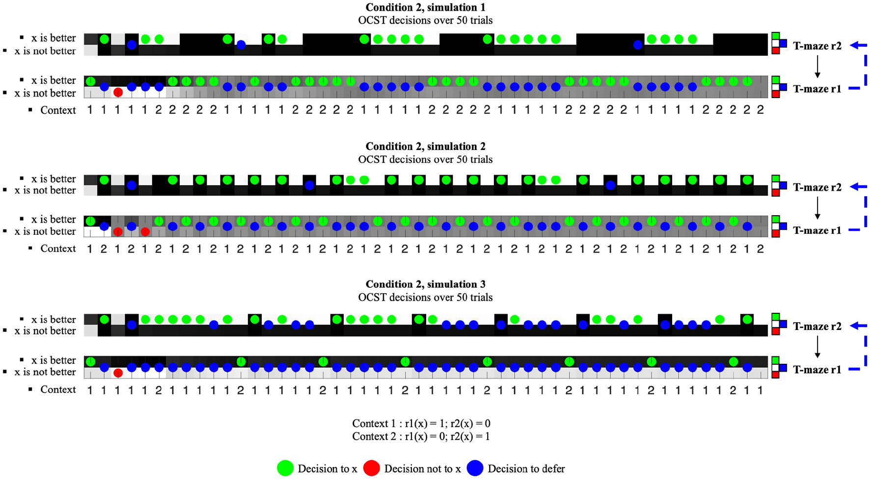 The 3 simulations under condition 1 show how our model for OCST remains robust despite irregularities, or fluctuations in context (Table 2). Under condition 1 (Figure 4), our OCST is supposed to function just like a normal rulebook-based OCST, giving priority to the price rule (r1). Under context 1, the OCST learns to refuse to warm up, and learns to cool down in context 2, irrespective of the patterns of context fluctuation. Figures 4, 5 show the decisions over the 50 trials, under each condition and simulation. In each figure, the green dots represent a decision to expend energy, which is allowed when r(o) = 0. The red dots represent the opposite decision. This depends on the context, which is represented as “1” or “2” at the bottom of the plot for each simulation. The top series in each plot represents the decision of the T-maze complying to the temperature rule (r2). The bottom series represents the decision of the T-maze complying to the price rule (r1). Blue dots indicate that the decision was to defer to the r2 T-maze when the blue dot is on the bottom series. Blue dots indicate that the trial ends on an “abstention” to act when the blue dot is on the top series and the bottom series. Each series is separated into 50 columns and 2 rows. The top row represents the beliefs about the context (i.e., o is better, or o is not better), which—depending on the T-maze at hand—will match the true context “1” or the true context “2”.