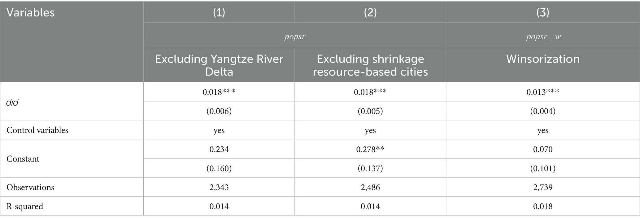Second, the regression analysis excludes samples of shrinkage resource-based cities. Given that shrinkage resource-based cities exhibit notable limitations in economic development, population mobility, among other aspects, urban population decline could stem from UADPPs or be attributable to the intrinsic traits of these cities. Therefore, this paper identifies shrinkage resource-based cities according to the list published in the Notice of the Chinese State Council on Issuing the National Sustainable Development Plan for Resource-based Cities (2013–2020), and then performs baseline regression after excluding these cities. The results are shown in Column (2) of Table 7.