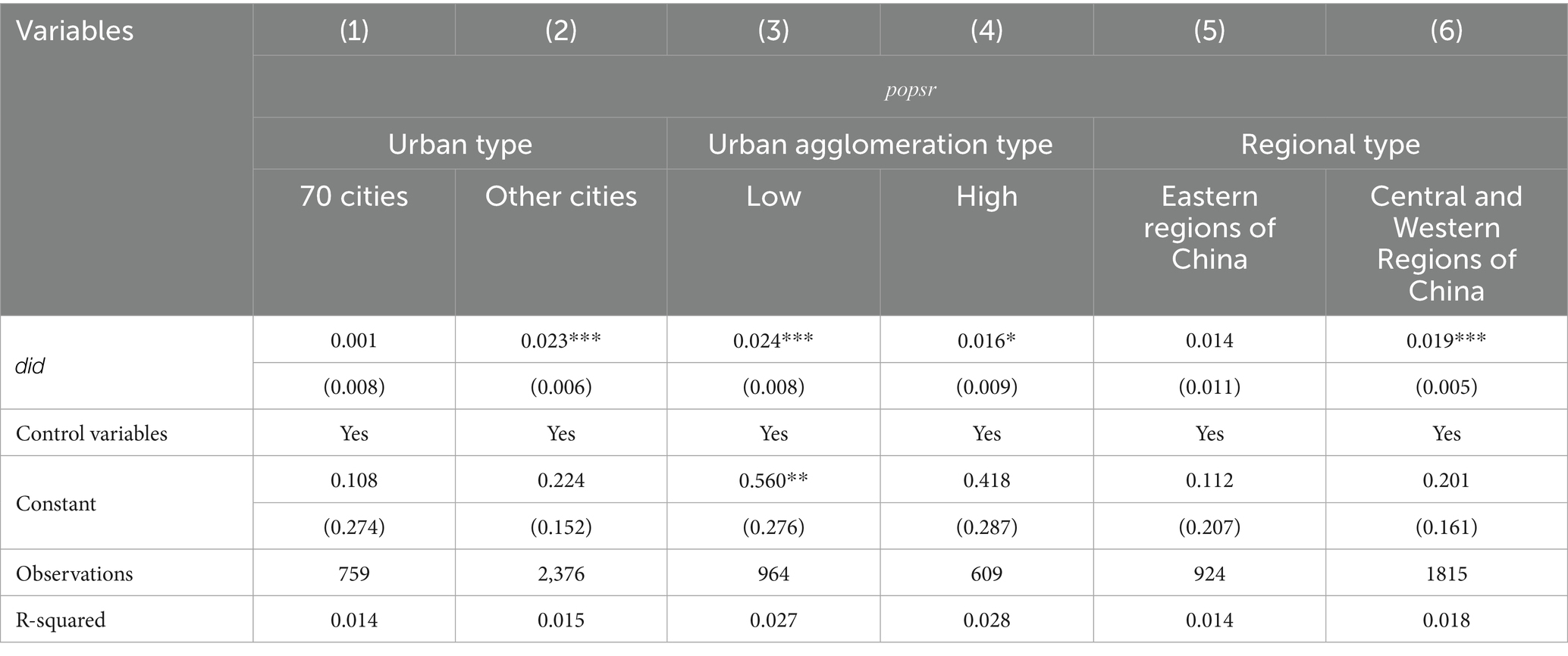 The baseline regression results reveal that UADPPs significantly accelerate urban population decline, and findings from robustness checks further validate the consistency of this conclusion. However, the acceleration effect of this policy on urban population decline is likely to exhibit heterogeneity across city typologies, agglomeration configurations, and regional contexts. Therefore, this section will carry out heterogeneity tests on the baseline regression results.