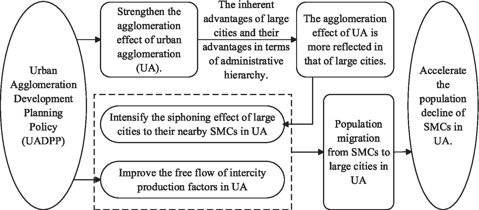 As the most advanced spatial form of urban development in its mature stage, UA inherently exhibits strong agglomeration effect (Chung et al., 2021). This agglomeration effect can generate dual effects: the spillover effect and the siphoning effect. Core cities within UAs drive development in surrounding and outlying cities through knowledge, technology, and capital diffusion via a spillover mechanism (Chen et al., 2023). Conversely, core cities attract economic and social resources from surrounding areas, particularly accelerated by transportation network upgrades via a siphoning mechanism (Jiao et al., 2024). Not limited to the situation that population agglomeration in central cities leads to a population siphoning effect in surrounding cities (Zheng et al., 2024). UAs demonstrate strong siphoning effects on non-agglomeration areas (Leonardi and Moretti, 2023), driving population migration from non-agglomerations to agglomerations. Concurrently, the siphoning effect induces population mobility that may trigger population decline, primarily affecting SMCs within agglomerations, which often experience latent population decline (He et al., 2023). As an innovative institutional design for regional integration and breaking administrative barriers, UADPPs exhibit dual impacts. One is about the factor flow and market integration. UADPPs significantly facilitate cross-provincial mobility of technological, capital, and population factors, fostering a unified regional market system and enabling free flow and efficient agglomeration of resources (Sun et al., 2022). However, this process intensifies the unidirectional “siphoning” of the population toward core cities (Yang et al., 2024). Another is about equity enhancement and structural upgrading. UADPPs elevate regional average income levels and narrow development gaps between central and non-central cities (Hu et al., 2024). Through technological innovation, industrial restructuring, and optimized resource allocation, UADPPs promote high-quality urban economic growth while mitigating the “agglomeration shadow” effect within agglomerations (Yao and Luo, 2024).