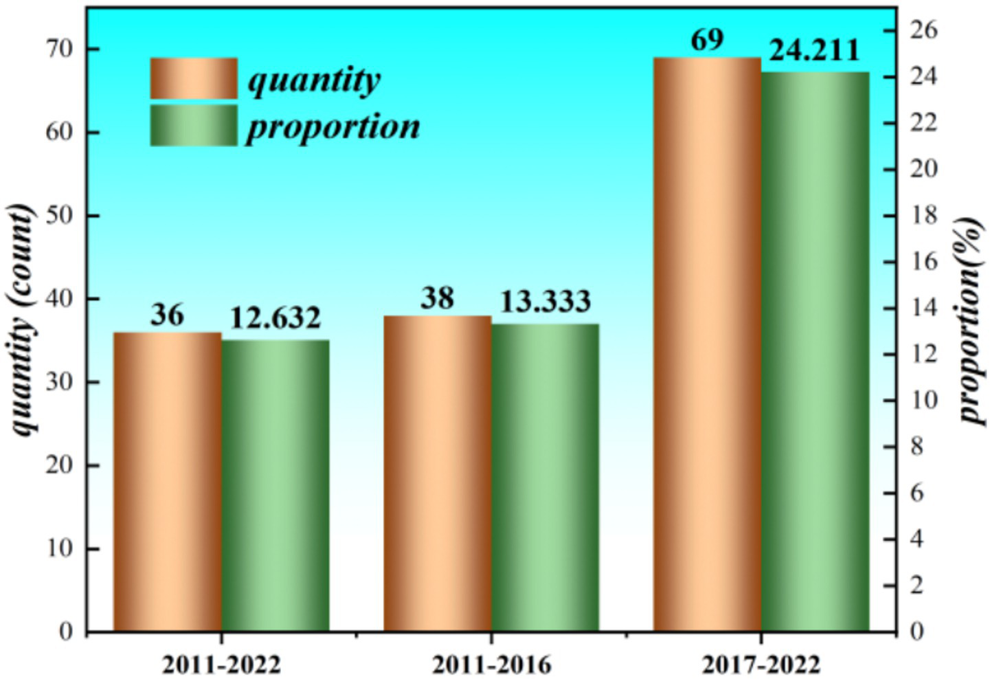 The choice of 2011 as the baseline observation year is rooted in China’s demographic shift to an urban-majority society in that year (Wang et al., 2021). Considering the majority of UADPPs were approved in 2016, we decompose population decline dynamics into two subperiods: 2011–2016 and 2017–2022. This temporal division enables a nuanced analysis of population trend dynamics of policy rollout. Figure 2 illustrates the results. Bar chart displays quantities and proportions for time periods 2011-2022, 2011-2016, and 2017-2022. The values are as follows: 36, 38, and 69 for quantities and 12.632, 13.333, and 24.211 for proportions.
