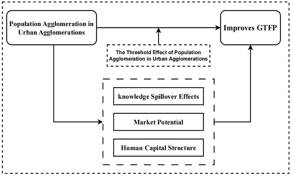 However, the current research frontier highlights a significant gap: the underexplored role of population agglomeration in urban agglomerations in shaping GTFP. While population, labor, and talent are crucial elements for regional economic and social development, the specific dynamics of how their agglomeration at the multi-city scale influences GTFP remain largely unexamined. In fact, population agglomeration in China's cross-administrative urban agglomerations not only provides high-quality human capital but also promotes the emergence of knowledge spillover effects and the formation of regional market integration (Cai et al., 2023). Critically, these mechanisms operate with distinct characteristics and often greater effectiveness at the urban agglomeration scale due to unique factors such as inter-city specialization, integrated regional markets, and polycentric structures that can collectively enhance GTFP beyond what is achievable within a single urban boundary. Yet, empirical evidence specifically examining these nuanced aspects is still lacking. Therefore, focusing on China's urban agglomerations, this study seeks to systematically examine the impacts and underlying mechanisms of population agglomeration in urban agglomerations on GTFP, offering theoretical insights and practical implications for sustainable development.