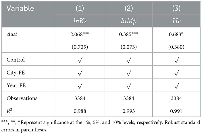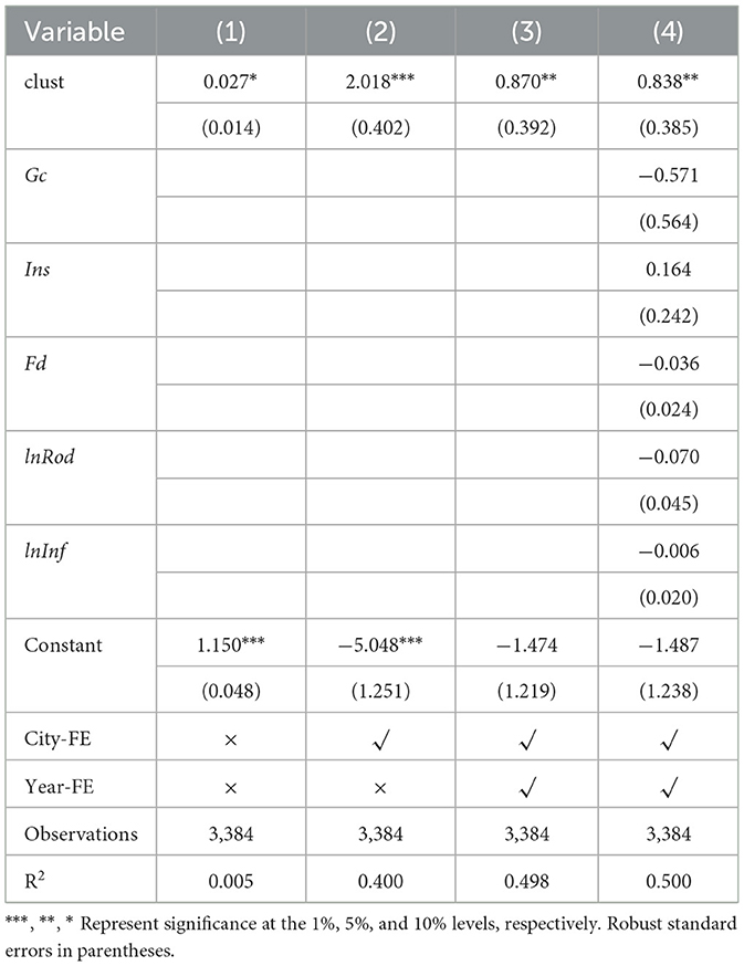 Where i and t denote city and year, respectively. GTFP represents urban Green Total Factor Productivity, while clust measures population agglomeration in urban agglomerations. The vector Xit includes control variables. λi and μt capture city-specific and time-fixed effects, respectively. Finally, εit is the error term, with standard errors clustered at the city level.