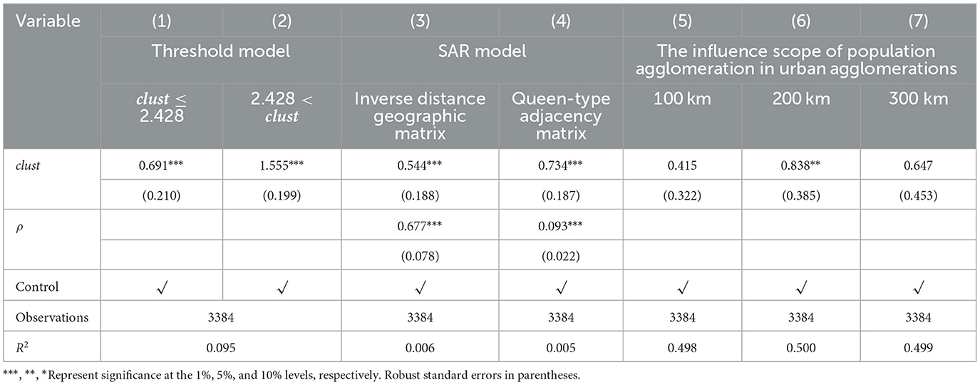 In the baseline regression, this paper adopts 200 kms as the geographic distance threshold for selecting neighboring cities. To further examine the scope of influence of population agglomeration in urban agglomerations, this paper extends the distance threshold and conducts separate regressions. As shown in columns (5), (6), and (7) of Table 7, within the range of 100–300 kms, the coefficient of population agglomeration in urban agglomerations is significantly positive only at the specific distance of 200 kms, and the coefficient value reaches the maximum at this point, indicating that the population agglomeration effect of urban agglomerations has a specific reasonable spatial scope. This also reflects the rationality and feasibility of the 200-km distance range in actual urban agglomeration planning. Therefore, constructing urban clusters by taking the average distance between a city and other cities within the 19 urban agglomerations specified in China's policy planning documents as the geographic distance threshold (i.e., 200 kms) not only conforms to the spatial scope where the population agglomeration effect of urban agglomerations can be effectively exerted but also provides a relatively balanced and efficient green development space for cities within the urban agglomeration. This research conclusion offers new policy insights for the government to accurately understand the scope of policy implementation and maximize the population agglomeration efficiency of urban agglomerations in promoting the urban agglomeration strategy.