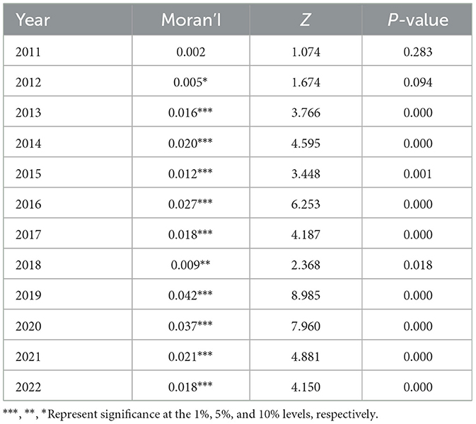 Before conducting spatial econometric analysis, this study verified the presence of spatial correlation in GTFP. Moran's I statistic was employed to calculate the annual spatial effects using an inverse distance geographic matrix. As shown in Table 8, Moran's I for GTFP is positive and statistically significant in most years, indicating strong spatial autocorrelation of GTFP across Chinese cities.