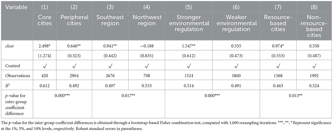 According to the “National Sustainable Development Plan for Resource-Based Cities (2013–2020)” issued by the State Council of the People's Republic of China, the sample is split into resource-based cities and non-resource-based cities for subgroup regression analysis. Regression results in Columns (7) and (8) of Table 9 show that within the resource-based city subsample, population agglomeration in urban agglomerations exerts a positive impact on GTFP. In contrast, within the non-resource-based city subsample, such agglomeration has no significant impact on GTFP. Furthermore, the difference in the coefficients of this agglomeration between the two groups is statistically significant at the 5% level. This indicates that population agglomeration in urban agglomerations only exerts a significantly positive effect on urban GTFP within the resource-based city subsample. A plausible explanation for this result is that, compared with non-resource-based cities, resource-based cities typically feature a homogeneous industrial structure, low efficiency in land and energy utilization, and high carbon emissions. Such cities, therefore, urgently need to undergo green and intelligent transformation. Within urban agglomerations, population agglomeration can attract high-caliber talent, including technical and innovative professionals, into resource-based cities. Consequently, population agglomeration in urban agglomerations plays a crucial role in enhancing the GTFP of resource-based cities.