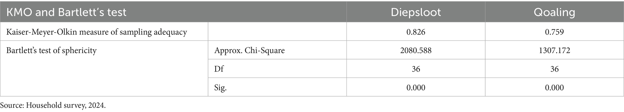 Urban planners, municipal officials, and various stakeholders enact different strategies to tackle the housing issues in their regions. The effects of these solutions are experienced and recognized by those who are directly impacted by the housing challenges. As a result, these individuals are in the best position to evaluate whether the government is adequately addressing the issues or not. Thus, to assess if the government is sufficiently addressing the housing problems, the suitability of the sample was evaluated using the Kaiser-Meyer-Olkin Measure (KMO). A KMO value of 0.759 was found for Diepsloot, and 0.826 for Qoaling. Meanwhile, Bartlett’s test of sphericity yielded a result of 0.000 for both, which is significant (p > 0.05). These findings indicate a correlation among the items, confirming their appropriateness for factor analysis for the two samples as detailed below.
