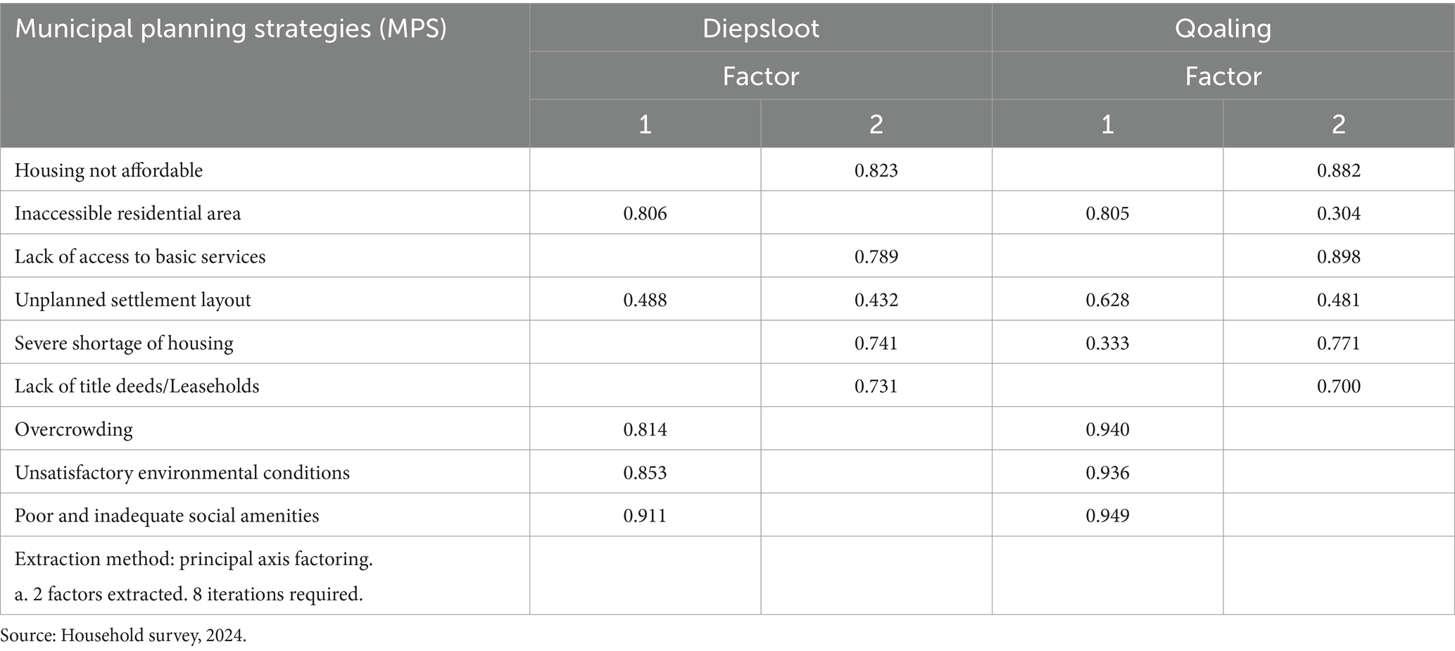 For both Qoaling and Diepsloot two factors were extracted using Principal Axis Factoring, which required eight iterations. The results revealed coherent patterns in the perceptions of the residents regarding the municipal planning and governance strategies in addressing housing problems in a quest to improve access to adequate housing in both contexts. In Diepsloot, the results with higher loadings exhibited in factor 1 indicate a strong deficiency in access to infrastructure which affects housing adequacy, whereas high loadings in factor 2 presents a different dimension aligning to housing affordability and tenure related challenges. Although there have been attempts by the municipalities to address these growing housing problems in Johannesburg in particular, according to Nokulunga et al. (2018:1698), the government has not been able to address these housing inadequacies effectively; instead, the RDP has exacerbated the problem, with some homes being poorly built using substandard materials, and many housing developments located on the outskirts of towns and cities where land is less expensive.